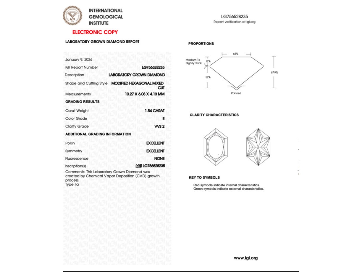 Product: Diamant - 1.54ct Dutch Marquise Cut ( IGI Gecertificeerd ) Conditie: Nieuw Specificaties: Lab-grown Diamond report: Aantal: 1 stuk Slijpvorm: Dutch Marquise geslepen Gewicht (carat): 1.54 carat Kleur: E Zuiverheid: VVS2 Polish: Excellent Symmetry: Excellent Fluoresence: None Certificaat: IGI (International Gemological Institute) Certificaat nummer: LG756528235 Conditie: Nieuw Verpakking: Komt met een Edelsteendoos en certificaat Het certificaat kan worden gecontroleerd op de officiële website van igi.org.