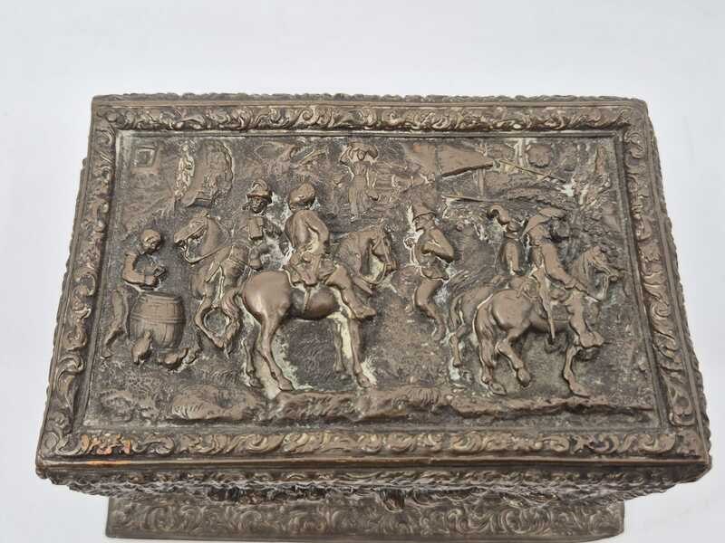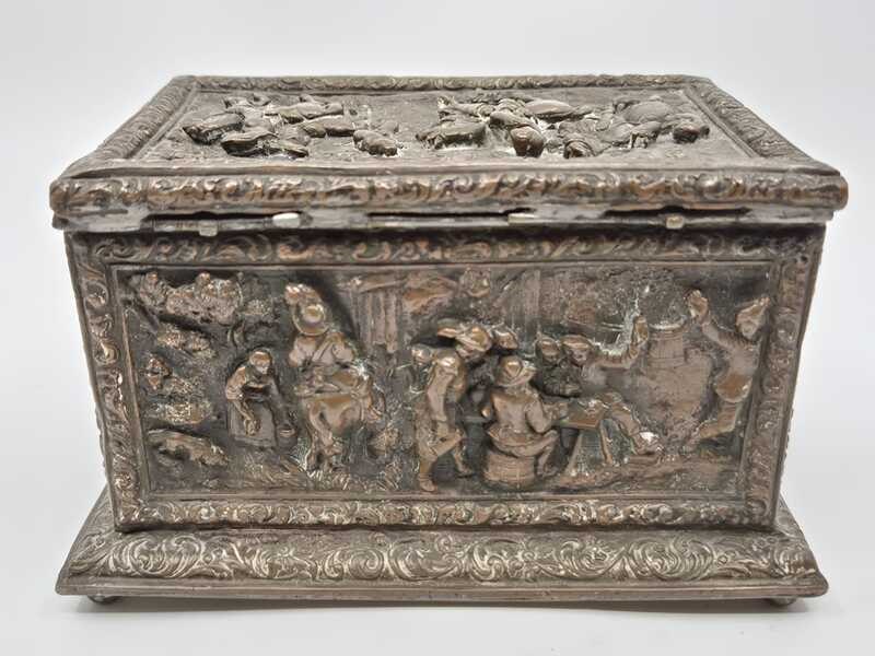 Product: Metalen sierkistje Specificaties: Decoratief rechthoekig sierkistje/opbergkistje uitgevoerd in metaal. Het kistje is rondom en op de deksel rijk voorzien van reliëfdecoraties met figuratieve taferelen en een ornamentale randafwerking. Het oppervlak vertoont patina en gebruikssporen passend bij leeftijd en gebruik. Sleutel ontbreekt Conditie: zie foto’s