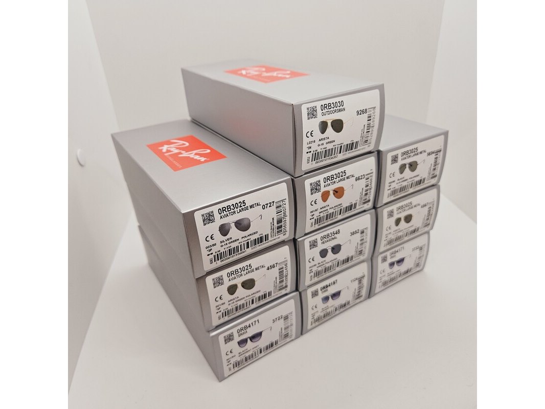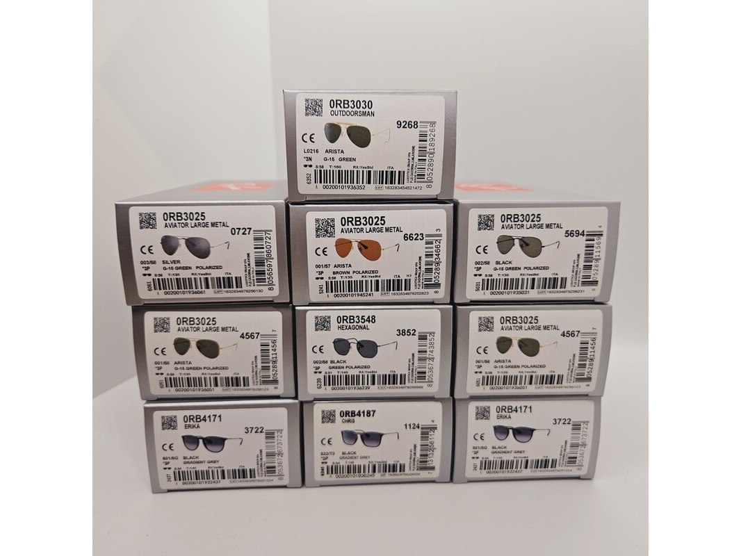 Product: Rayban Polarized zonnebrillen Aviator, Outdoorsman, Hexagonal, Chris, Erika... Conditie: Nieuw Specificaties: Partij van 10 Rayban Polarized zonnebrillen, allemaal nieuw, inclusief doos en toebehoren, zie laatste foto. Modellen: - 1 x Rayban Aviator Large Metal silver green polarized. - 1 x Rayban Aviator Large Metal black green polarized. - 1 x Rayban Aviator Large Metal arista brown polarized. - 2 x Rayban Aviator Large Metal arista green polarized. - 1 x Rayban Hexagonal black green polarized. - 1 x Rayban Outdoorsman arista green. - 2 x Rayban Erika black gradient grey. - 1 x Rayban Chris black gradient grey.