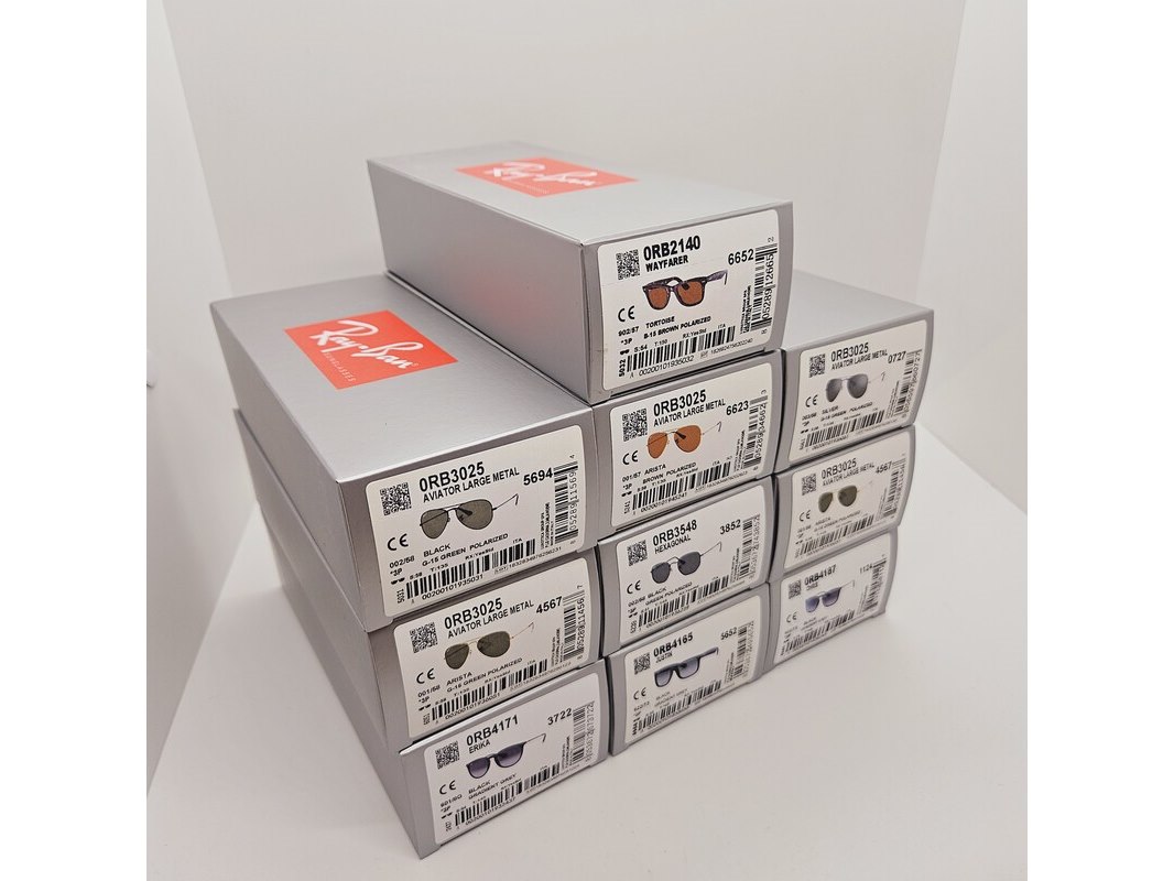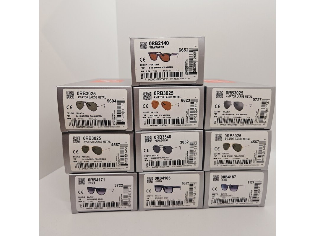 Product: Rayban Polarized zonnebrillen Aviator, Wayfarer, Hexagonal, Justin, Chris, Erika... Conditie: Nieuw Specificaties: Partij van 10 Rayban Polarized zonnebrillen, allemaal nieuw, inclusief doos en toebehoren, zie laatste foto. Modellen: - 1 x Rayban Aviator Large Metal silver green polarized. - 1 x Rayban Aviator Large Metal black green polarized. - 1 x Rayban Aviator Large Metal arista brown polarized. - 2 x Rayban Aviator Large Metal arista green polarized. - 1 x Rayban Hexagonal black green polarized. - 1 x Rayban Wayfarer Tortoise B-15 brown polarized. - 1 x Rayban Erika black gradient grey. - 1 x Rayban Chris black gradient grey. - 1 x Rayban Justin black gradient grey.