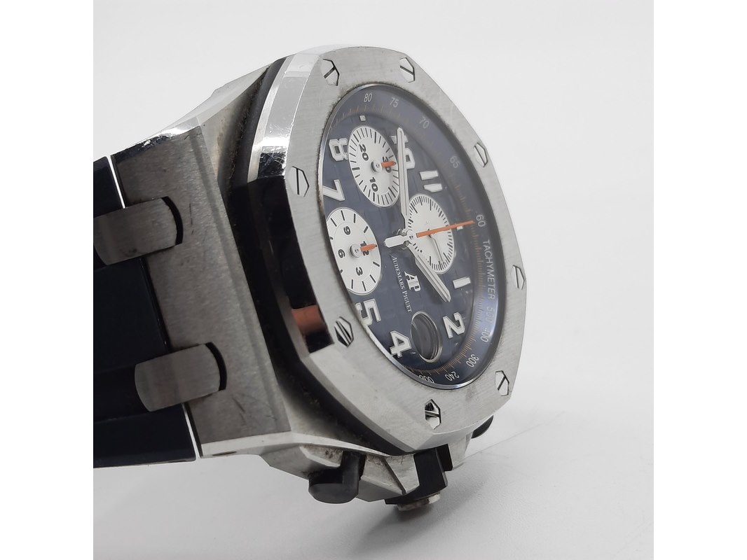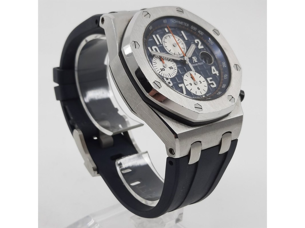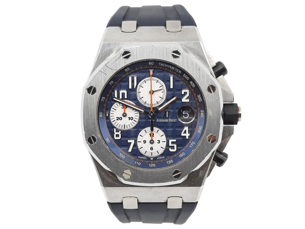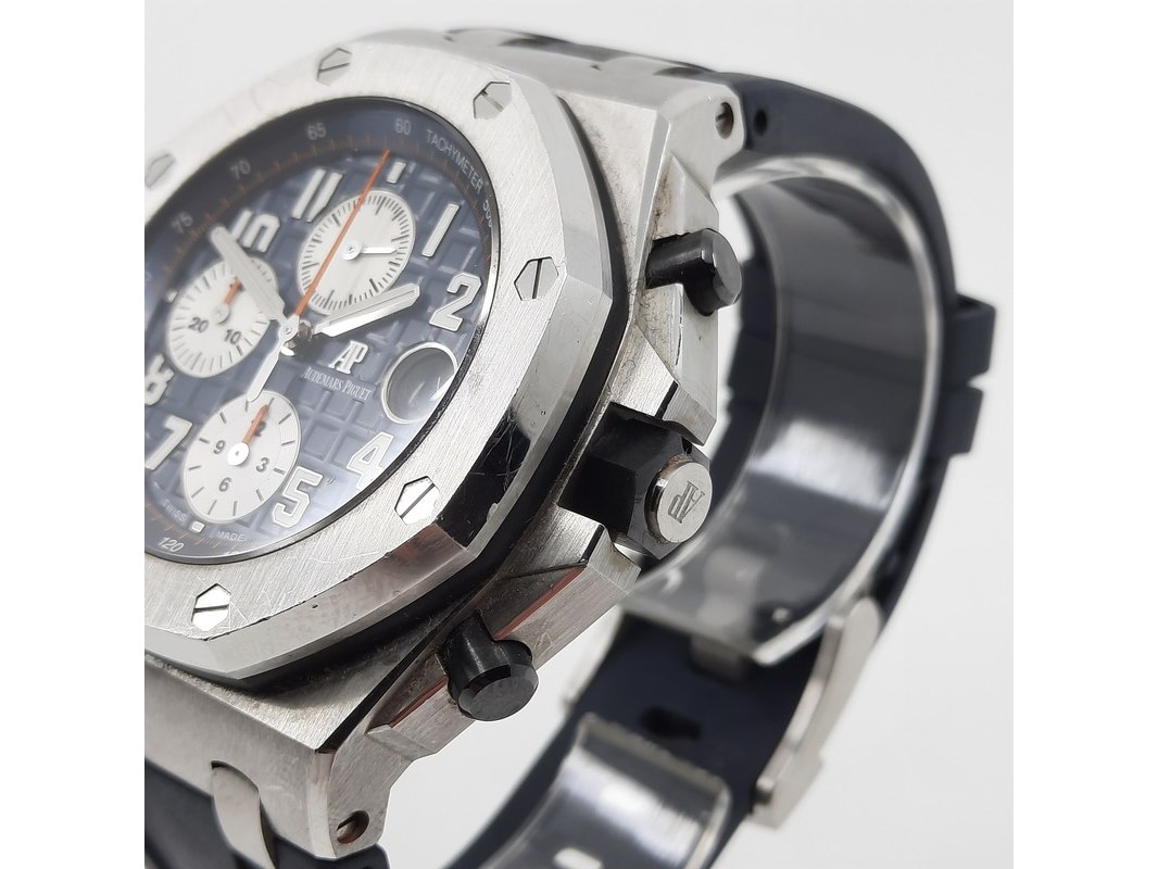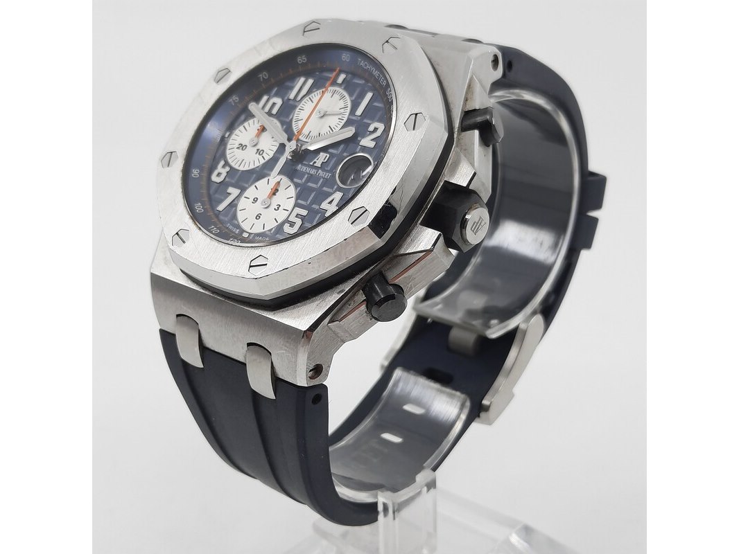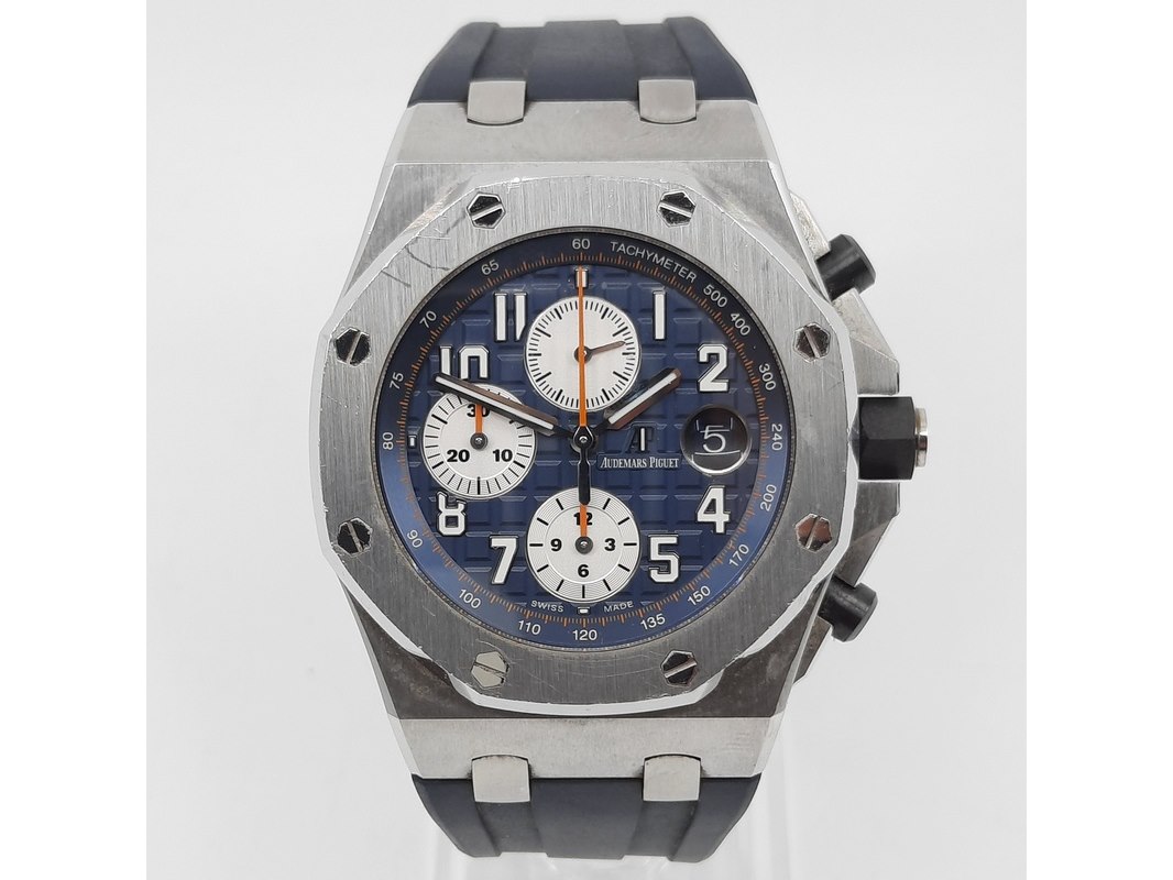 Merk: Audemars Piguet Product: Heren polshorloge Conditie: gebruikt Specificaties: Een onedel heren polshorloge, Audemars Piguet Royal Oak Offshore 26470ST.OO.A027CA.01. Met rubber lunet, blauwe wijzerplaat, drie registers, automatisch uurwerk, glasbodem en rubber band met stalen gesp. Geen doos en geen certificaat.
