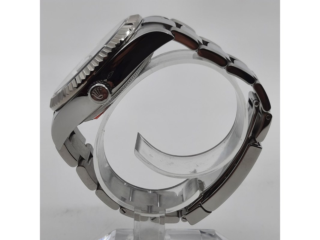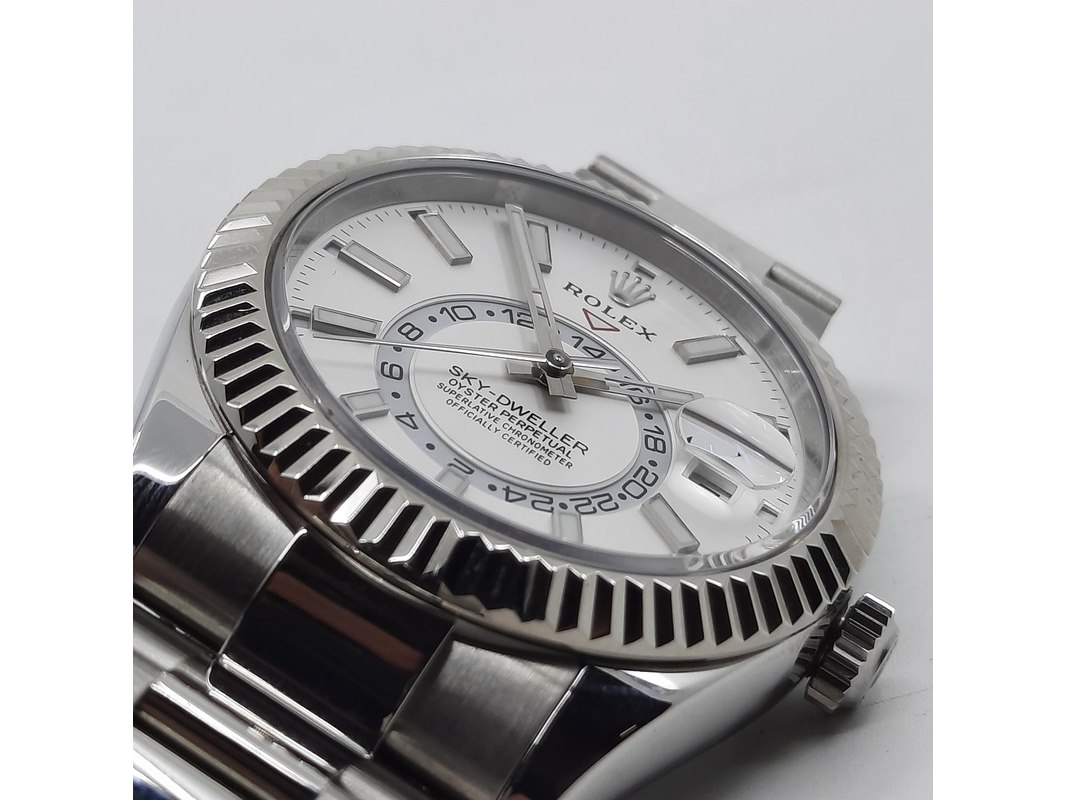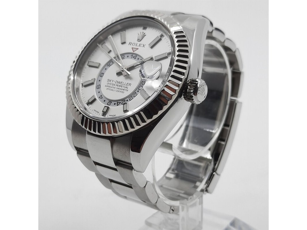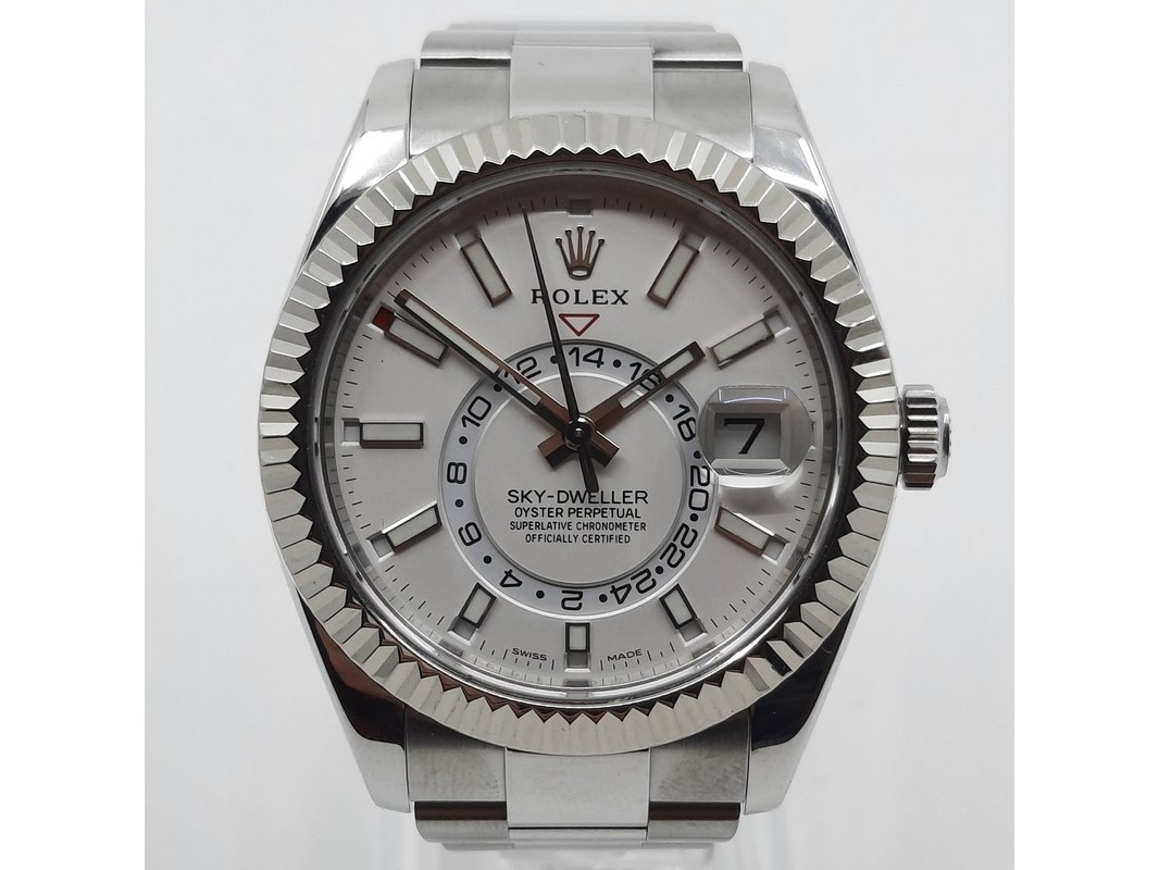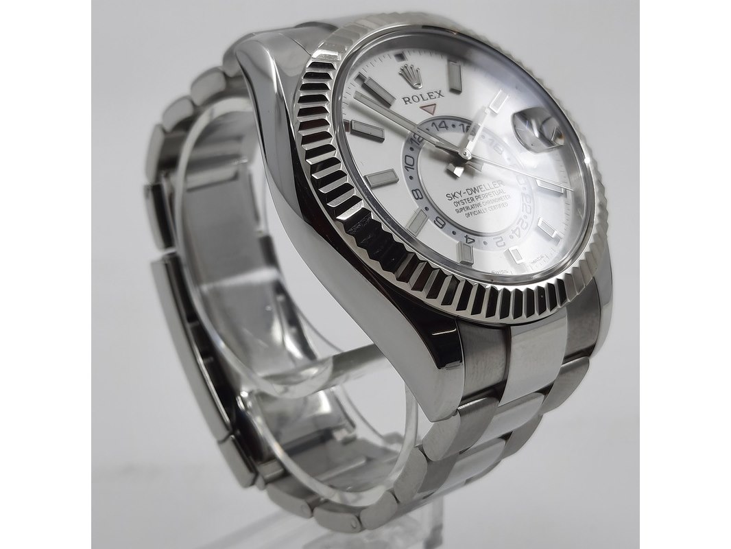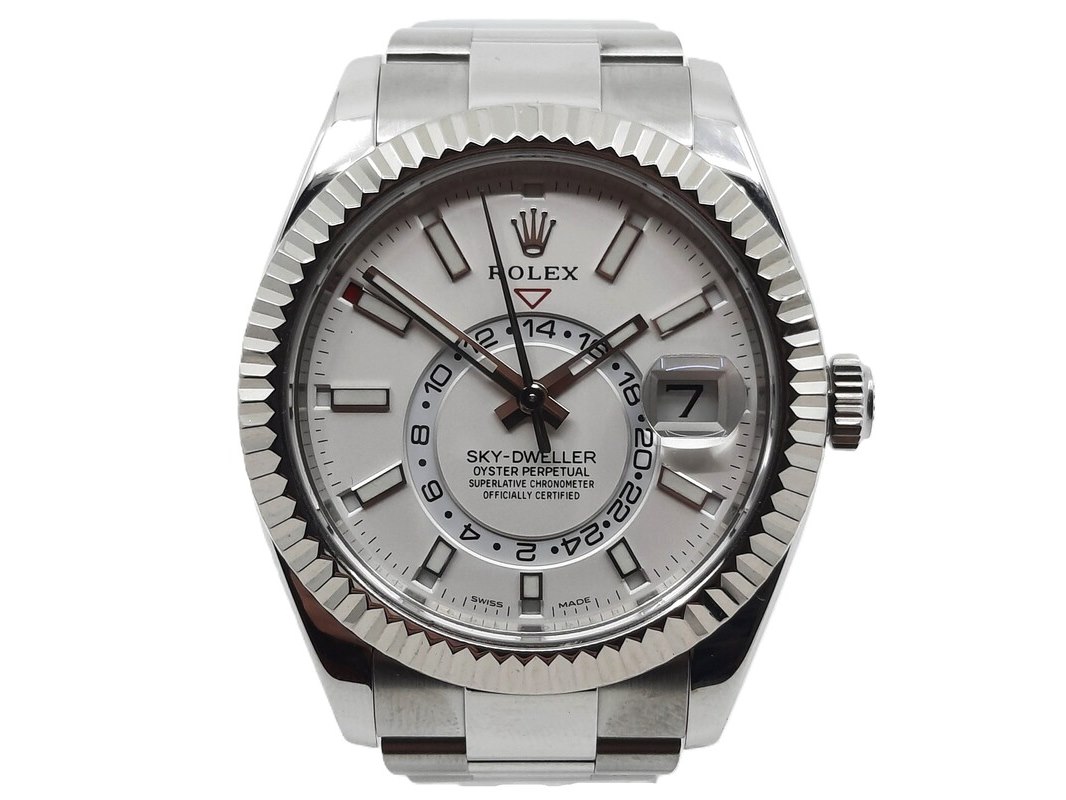 Merk: Rolex Product: Heren polshorloge Conditie: gebruikt Specificaties: Een stalen heren polshorloge, Rolex Sky Dweller 326934. Met witte wijzerplaat, witgouden lunet en stalen band met vouwsluiting. Met Rolex service pas en zakje. Geen doos en geen certificaat.
