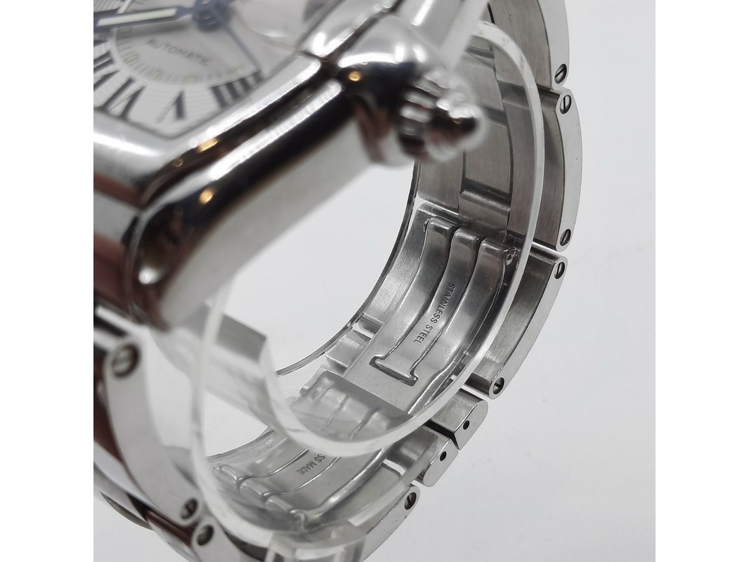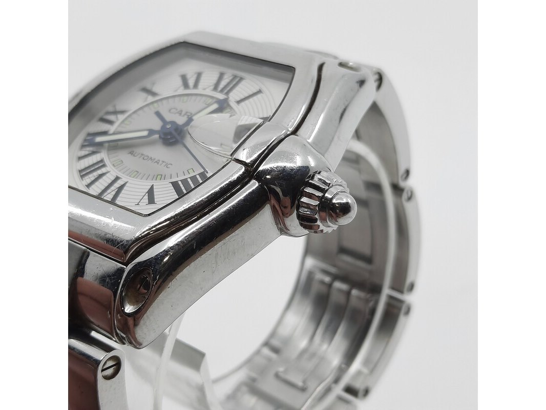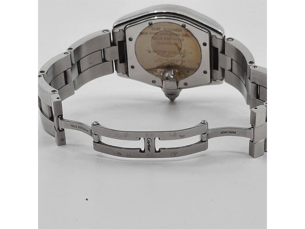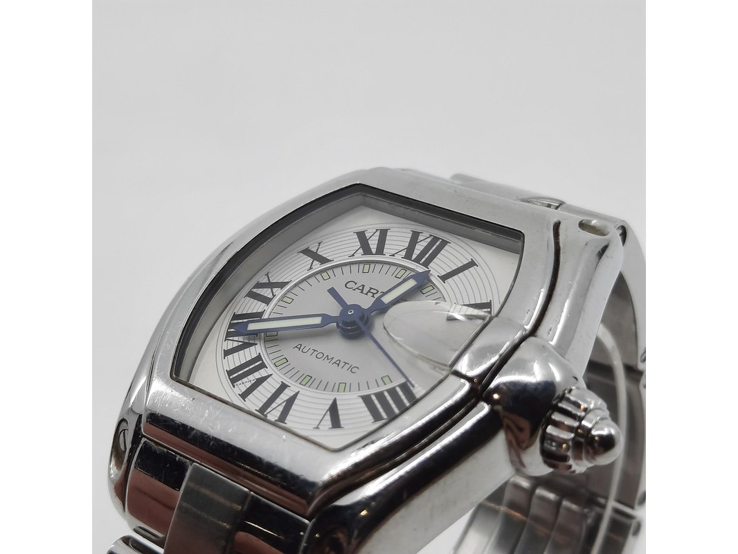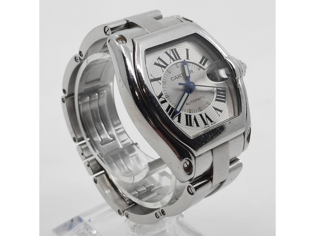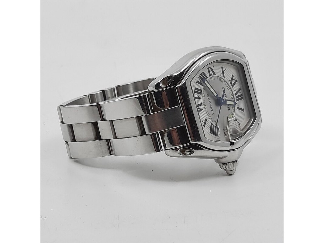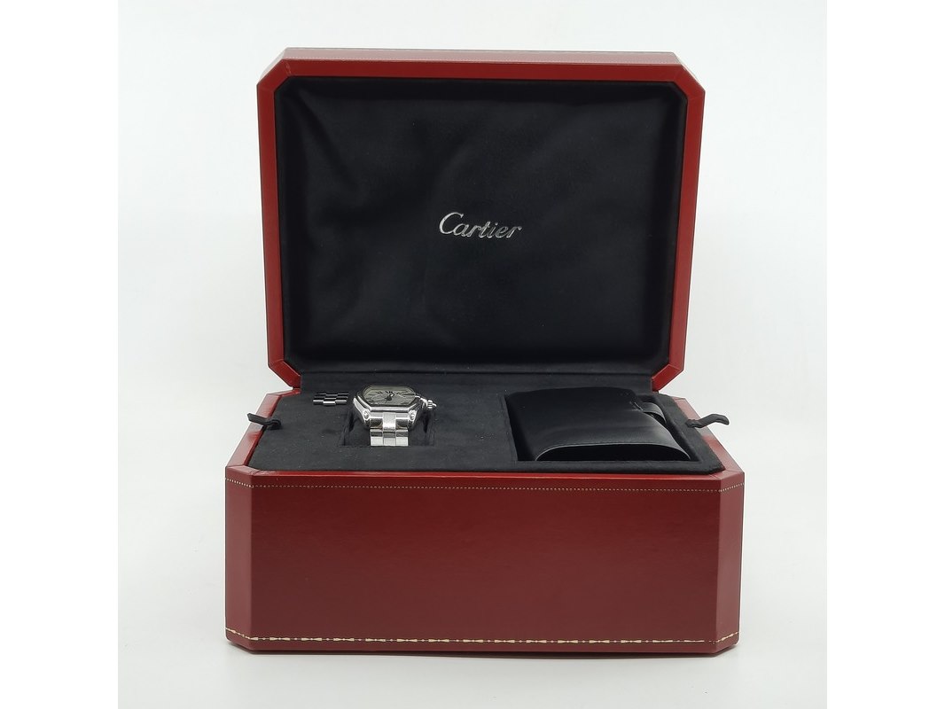Merk: Cartier Product: Heren polshorloge Conditie: gebruikt Specificaties: Een onedel heren polshorloge, Cartier Roadster 2510. Met tonvormige kast met argente wijzerplaat, automatisch uurwerk en stalen band met dubbele vouwsluiting. Inclusief reserveschakels, doos en certificaat.
