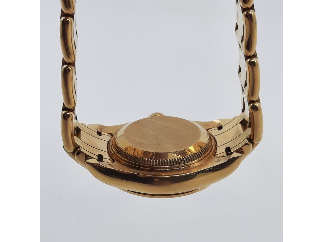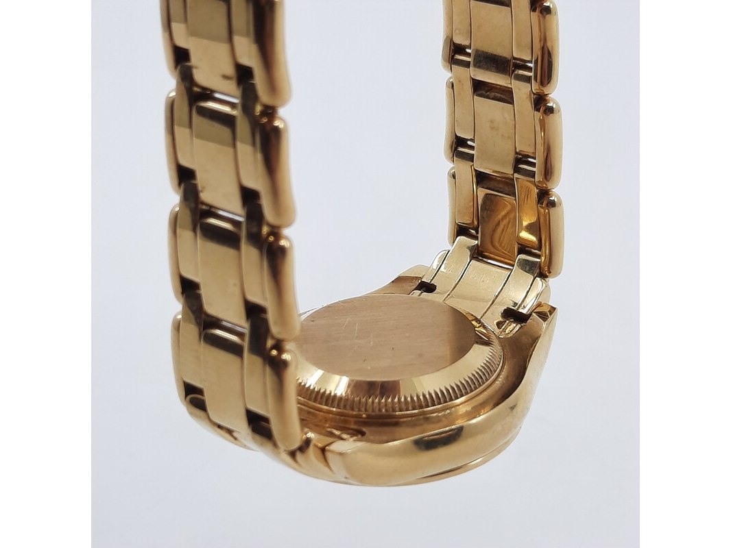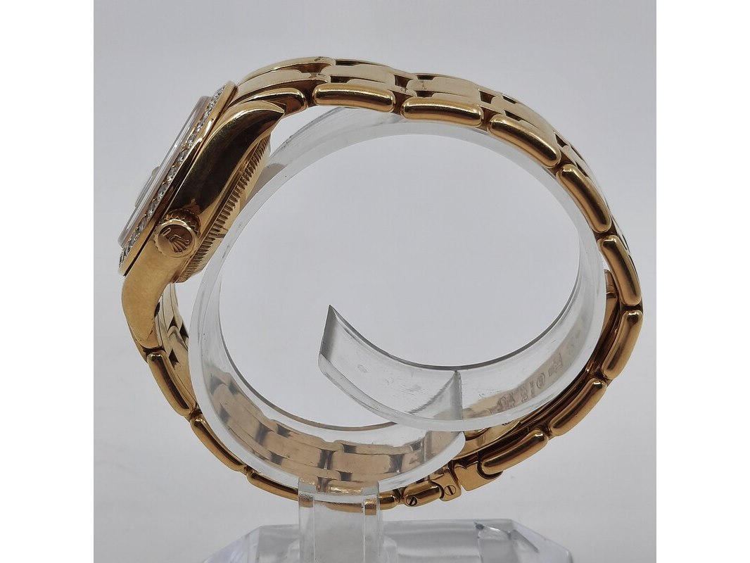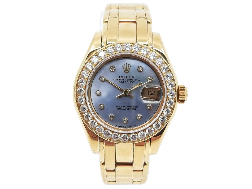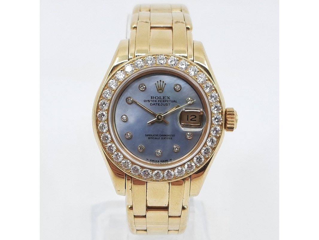 Merk: Rolex Product: Dames polshorloge Specificaties: Een geelgouden dames polshorloge, Rolex Datejust Pearlmaster. Met parelmoer wijzerplaat, lunet en wijzerplaat bezet met diamanten en geelgouden band met vouwsluiting. Bruto gewicht ca. 102.2 gram. Geen doos en geen certificaat.