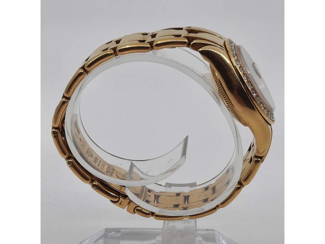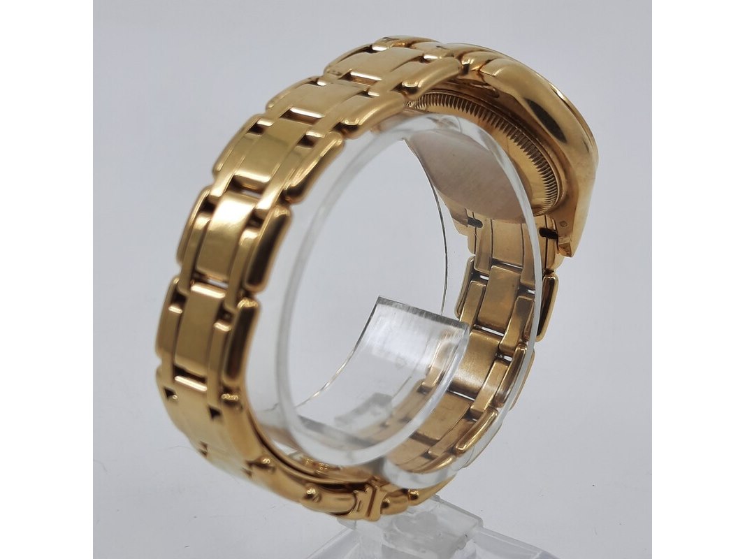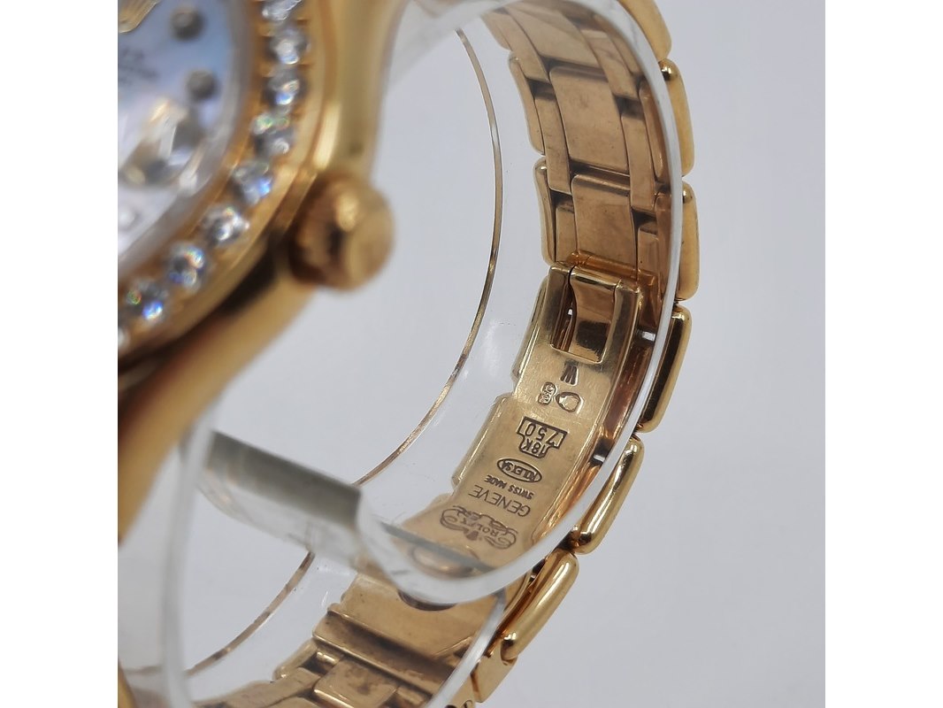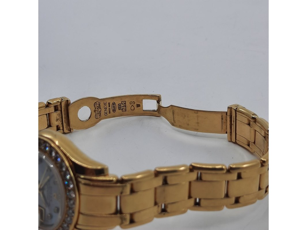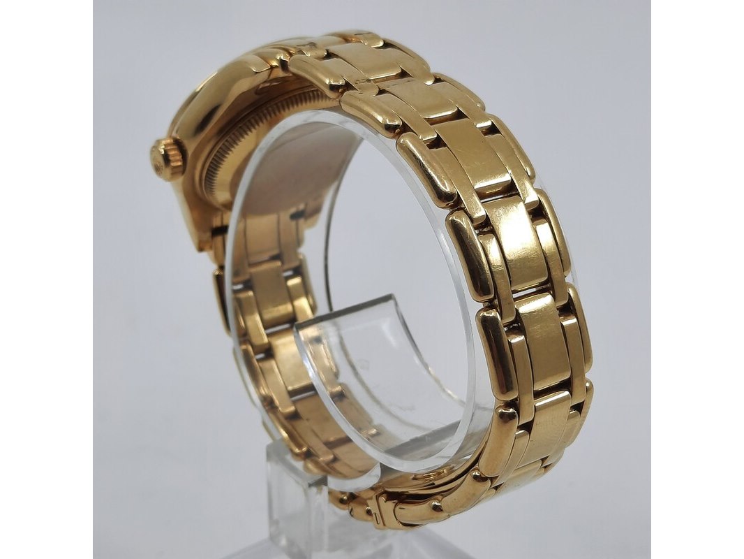 Merk: Rolex Product: Dames polshorloge Specificaties: Een geelgouden dames polshorloge, Rolex Datejust Pearlmaster. Met parelmoer wijzerplaat, lunet en wijzerplaat bezet met diamanten en geelgouden band met vouwsluiting. Bruto gewicht ca. 102.2 gram. Geen doos en geen certificaat.