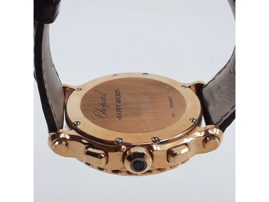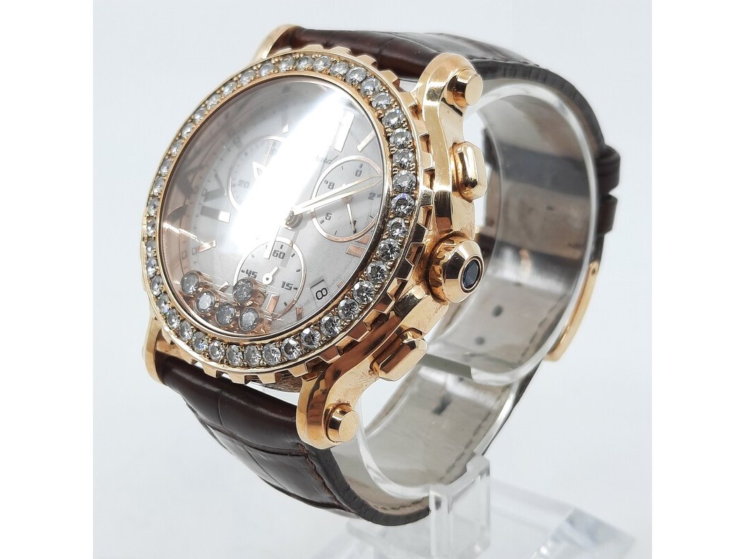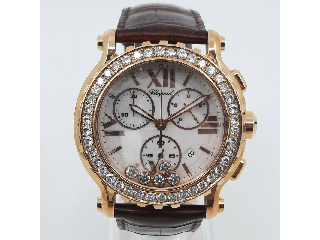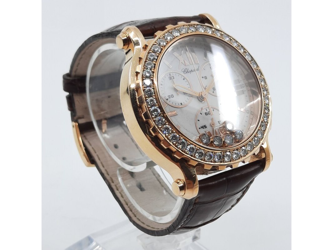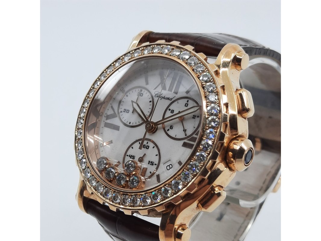 Merk: Chopard Product: Heren polshorloge Conditie: gebruikt Specificaties: Een roségouden heren polshorloge, Chopard Happy Sport. Met witte wijzerplaat, lunette bezet met briljant geslepen diamanten, quartz uurwerk (loopt niet) en lederen band met roségouden gesp. Horloge loopt niet, vermoedelijk batterij leeg (kast niet geopend). Geen doos en geen certificaat.