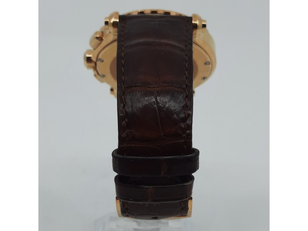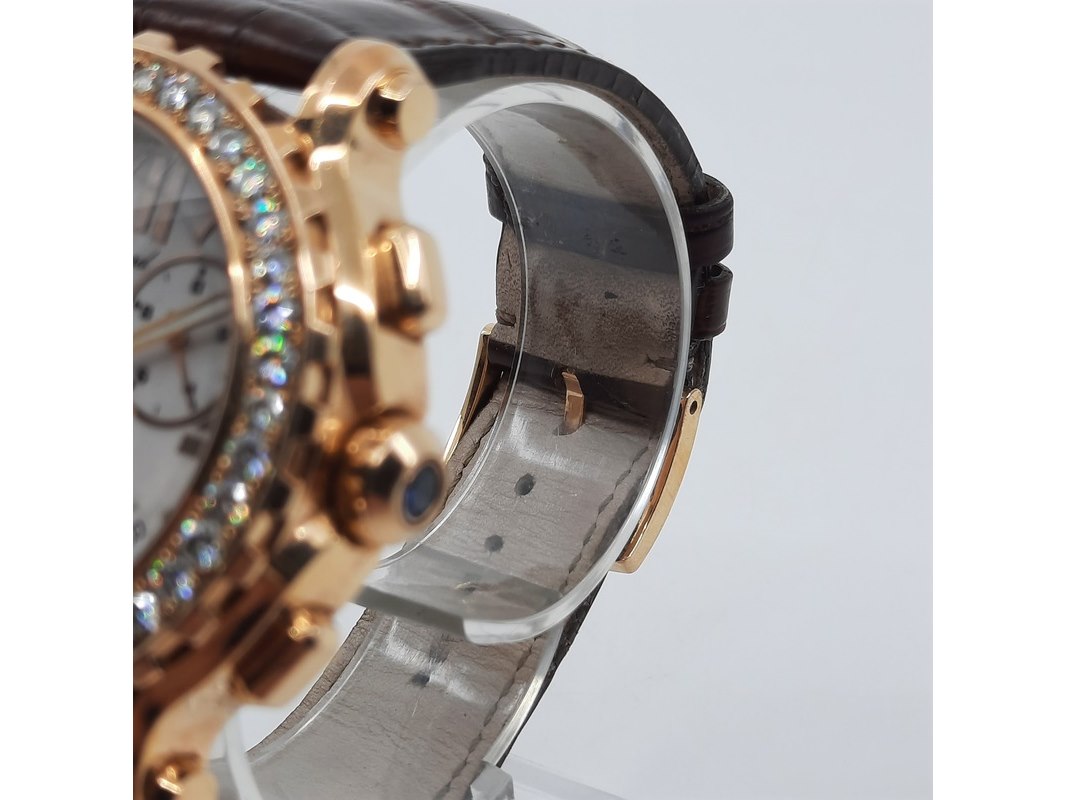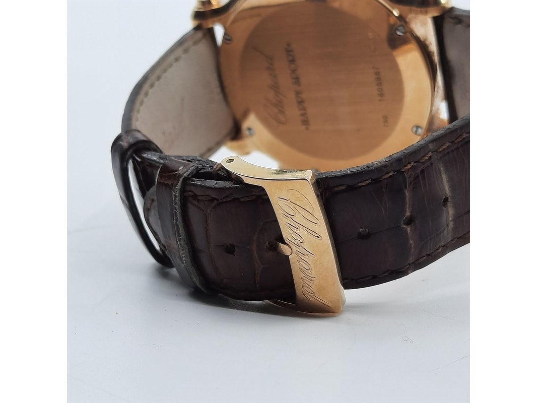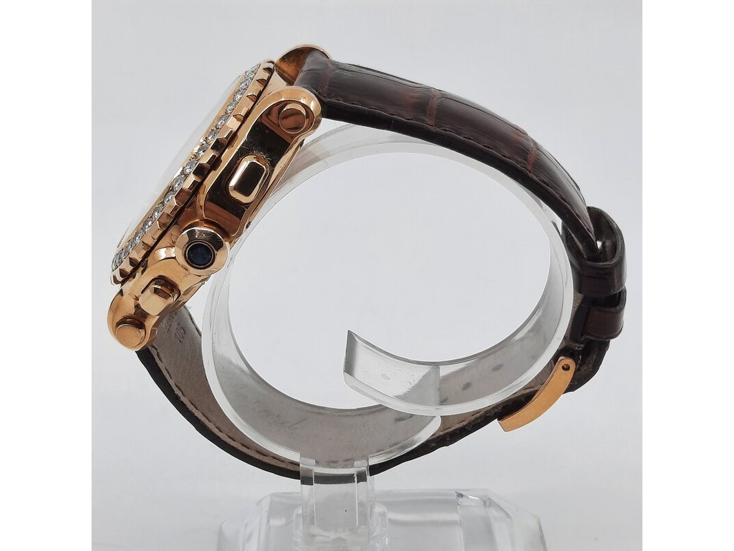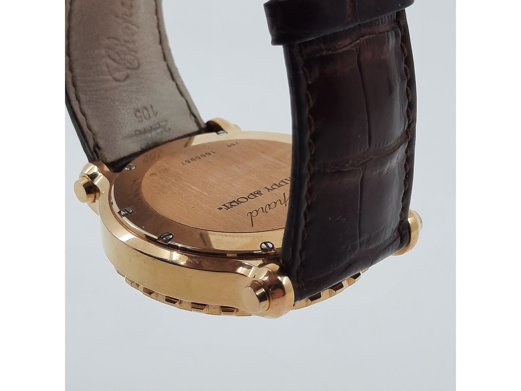 Merk: Chopard Product: Heren polshorloge Conditie: gebruikt Specificaties: Een roségouden heren polshorloge, Chopard Happy Sport. Met witte wijzerplaat, lunette bezet met briljant geslepen diamanten, quartz uurwerk (loopt niet) en lederen band met roségouden gesp. Horloge loopt niet, vermoedelijk batterij leeg (kast niet geopend). Geen doos en geen certificaat.