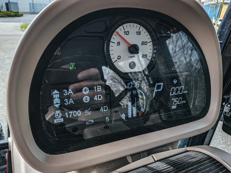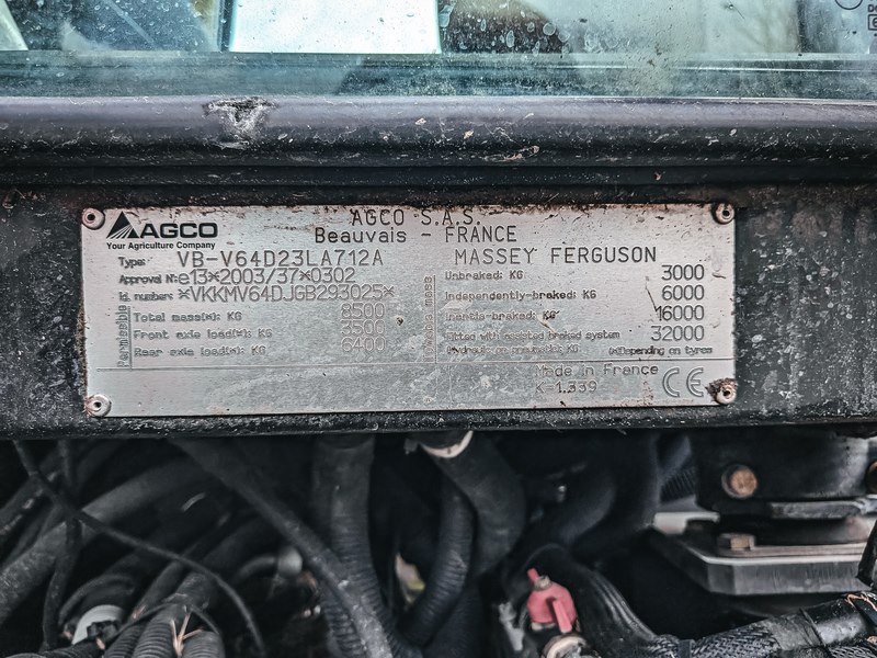 Merk: Massey Ferguson Product: Land- of bosbouwtrekker BouwJaar: 2016 Conditie: Gebruikt Specificaties: Basiskenmerken Kenteken: TKH-01-T Modeltype: VB-V64D23LA712A Identificatienummer: VKKMV64DJGB293025 Afgelezen tellerstand: 5.532 u. Brandstof: diesel Schakeling: 16+16/24+24 (vooruit + achteruit) Powershift: 4/6 Registratie Datum eerste toelating: 30 juni 2016 Motor Motorcode: 44AWI Aantal cilinders: 4TI (turbo/intercooler) Cilinderinhoud: 4.400 cm³ Max. vermogen: 105 pk Max. koppel: 468 Nm Prestaties Rijsnelheidsbereik: 1,7 - 43 km/h Max. rijsnelheid: 43 km/h Hydraulische pompcapaciteit: 58 (100) / 100 (110) L/min Max. hefvermogen achterhef: 5.200 kg Aftakas toerental: 540/750 tpm Gewichten Totaal massa: 8.500 kg Voorasbelasting: 3.500 kg Achterasbelasting: 6.400 kg Trekgewicht (ongeremd) : 3.000 kg Trekgewicht (onafhankelijk geremd) : 6.000 kg Trekgewicht (oplooprem) : 16.00 kg Trekgewicht (bekrachtigd remsysteem) : 32.000 kg