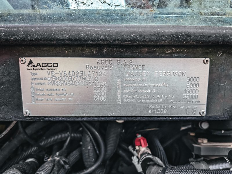 Merk: Massey Ferguson Product: Land- of bosbouwtrekker BouwJaar: 2016 Conditie: Gebruikt Specificaties: Basiskenmerken Kenteken: TKH-08-T Modeltype: VB-V64D23LA712A Identificatienummer: VKKMV64DAGB291019 Afgelezen tellerstand: 7.285 u. Brandstof: diesel Schakeling: 16+16/24+24 (vooruit + achteruit) Powershift: 4/6 Registratie Datum eerste toelating: 30 juni 2016 Motor Motorcode: 44AWI Aantal cilinders: 4TI (turbo/intercooler) Cilinderinhoud: 4.400 cm³ Max. vermogen: 105 pk Max. koppel: 468 Nm Prestaties Rijsnelheidsbereik: 1,7 - 43 km/h Max. rijsnelheid: 43 km/h Hydraulische pompcapaciteit: 58 (100) / 100 (110) L/min Max. hefvermogen achterhef: 5.200 kg Aftakas toerental: 540/750 tpm Gewichten Totaal massa: 8.500 kg Voorasbelasting: 3.500 kg Achterasbelasting: 6.400 kg Trekgewicht (ongeremd) : 3.000 kg Trekgewicht (onafhankelijk geremd) : 6.000 kg Trekgewicht (oplooprem) : 16.00 kg Trekgewicht (bekrachtigd remsysteem) : 32.000 kg Specificaties (voorlader) Merk: ålö Type: MF 946 EURO 3RD 4TH QL ESD Serienummer: 7454750 Bouwjaar: 2016 Gewicht: 585 kg
