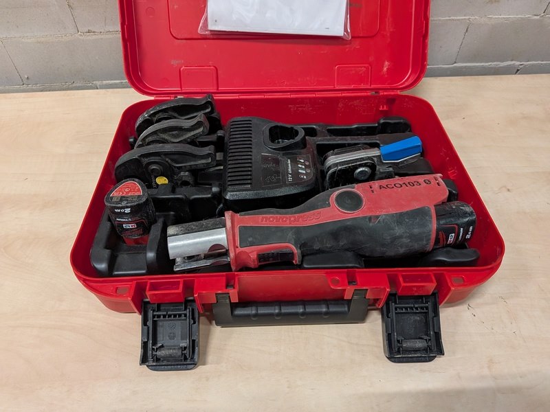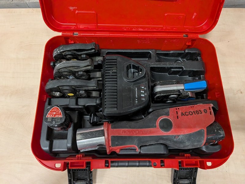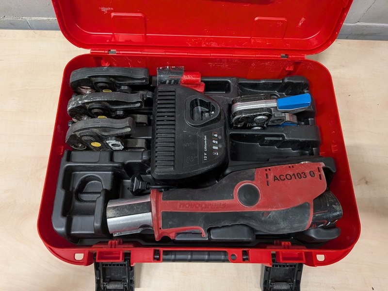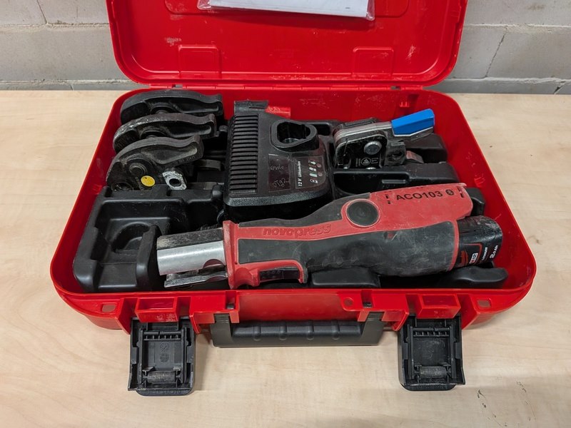 Merk: Novopress Product: Accu perstang BouwJaar: 2025 Specificaties: 2x accu 12V, 2.0Ah, lader, 4x persbek in koffer