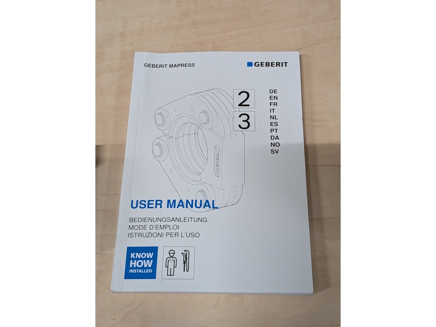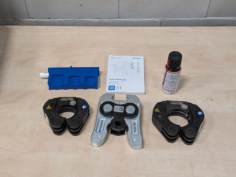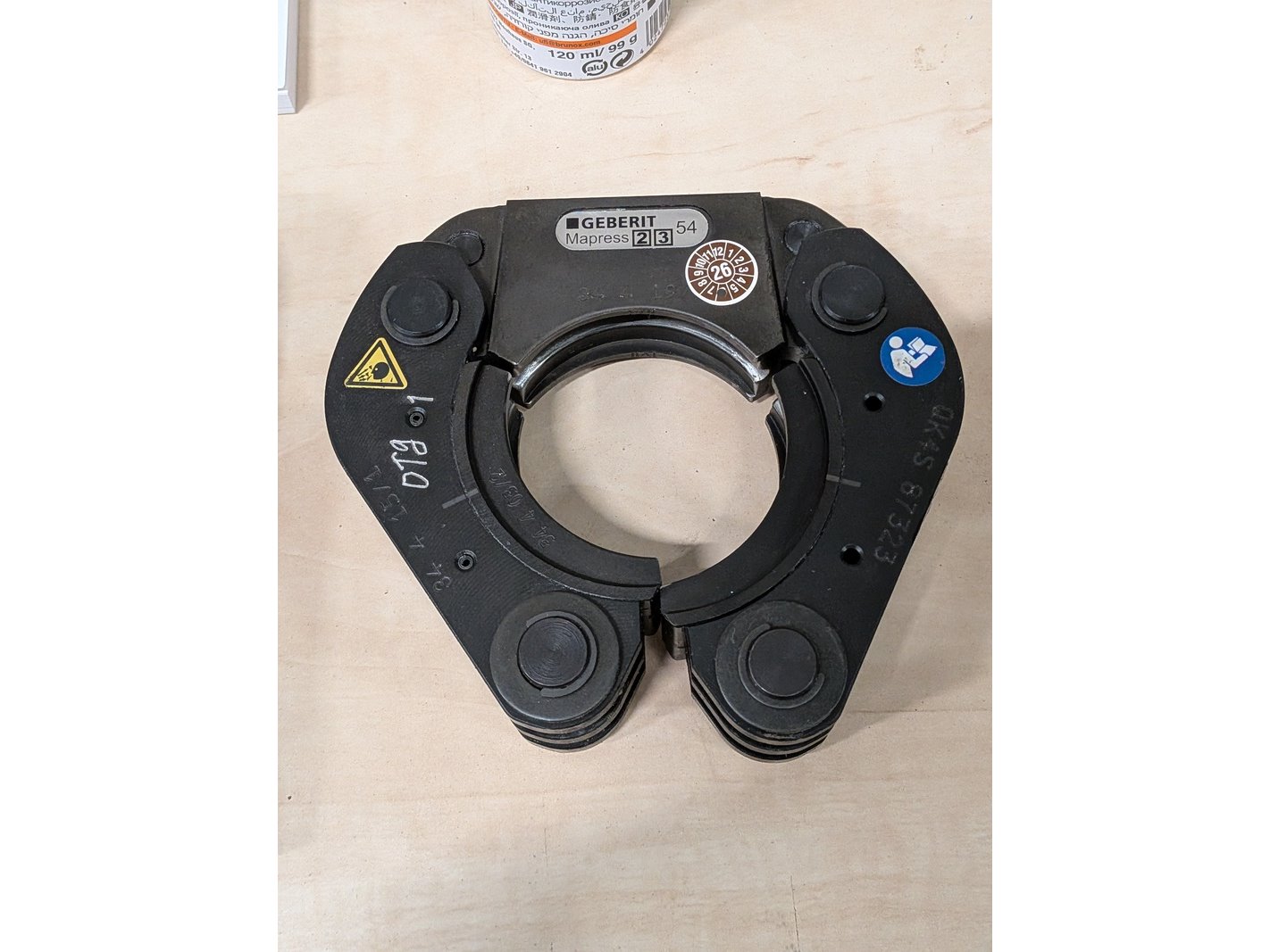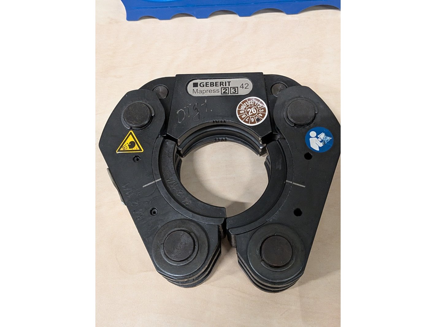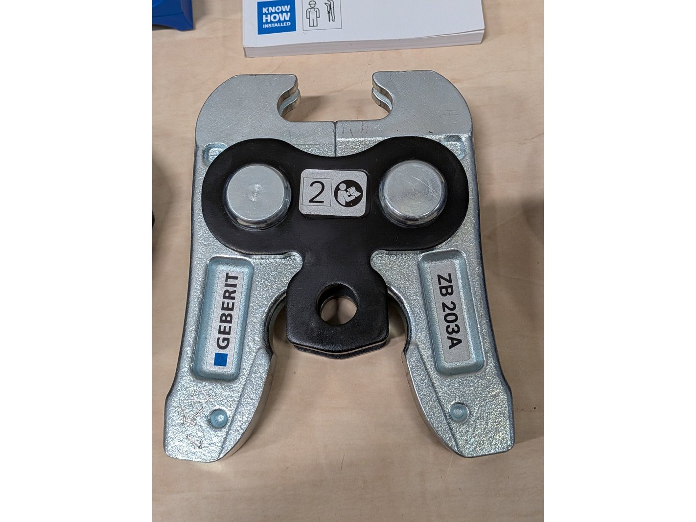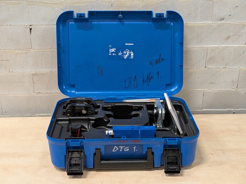 Merk: Geberit Product: Persbek set in koffer Specificaties: Bestaande uit 3x persbek: 42, 54, ZB 203A, met divers toebehoren in koffer