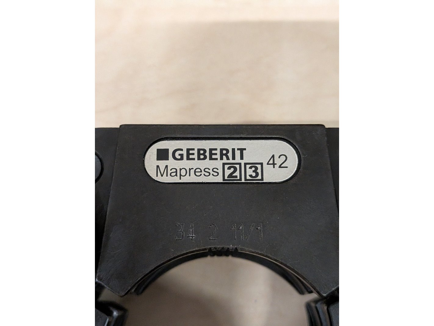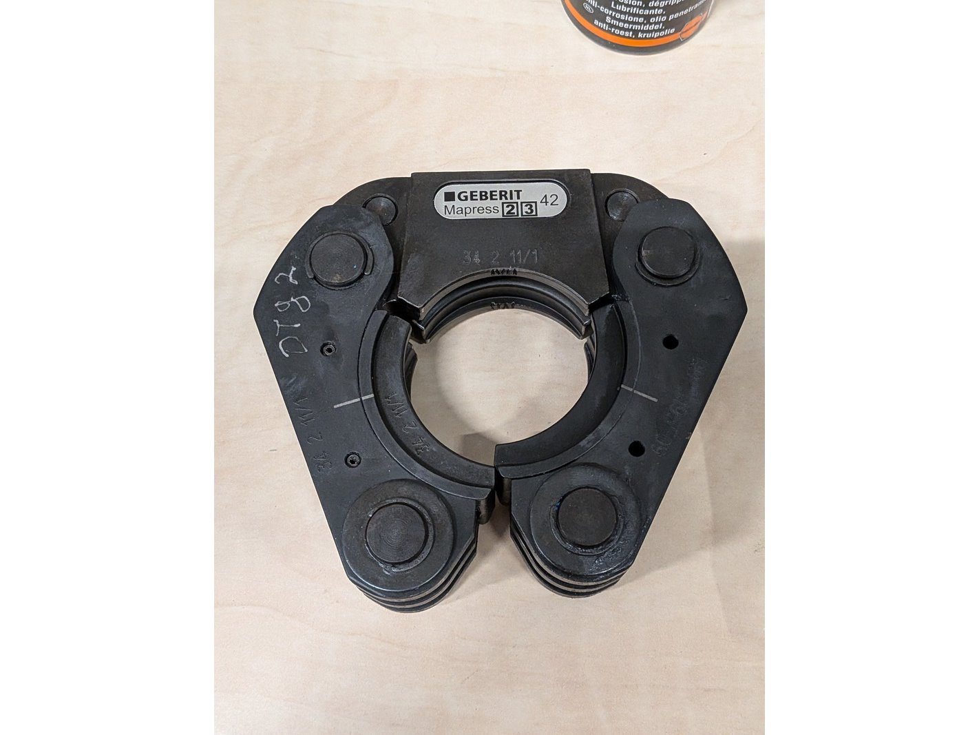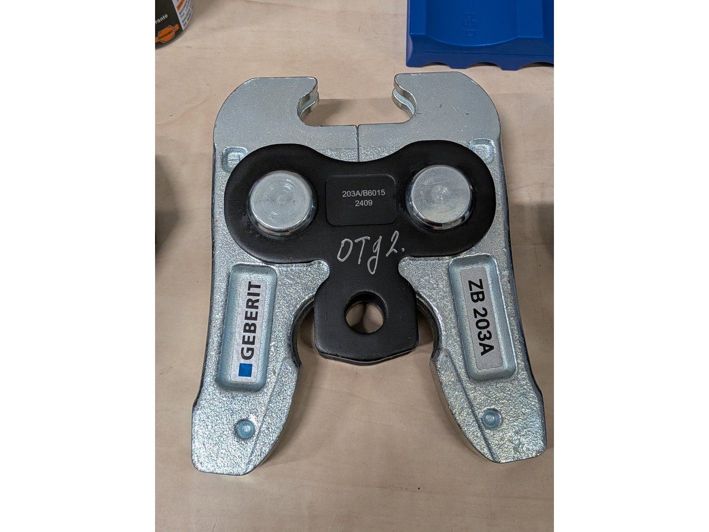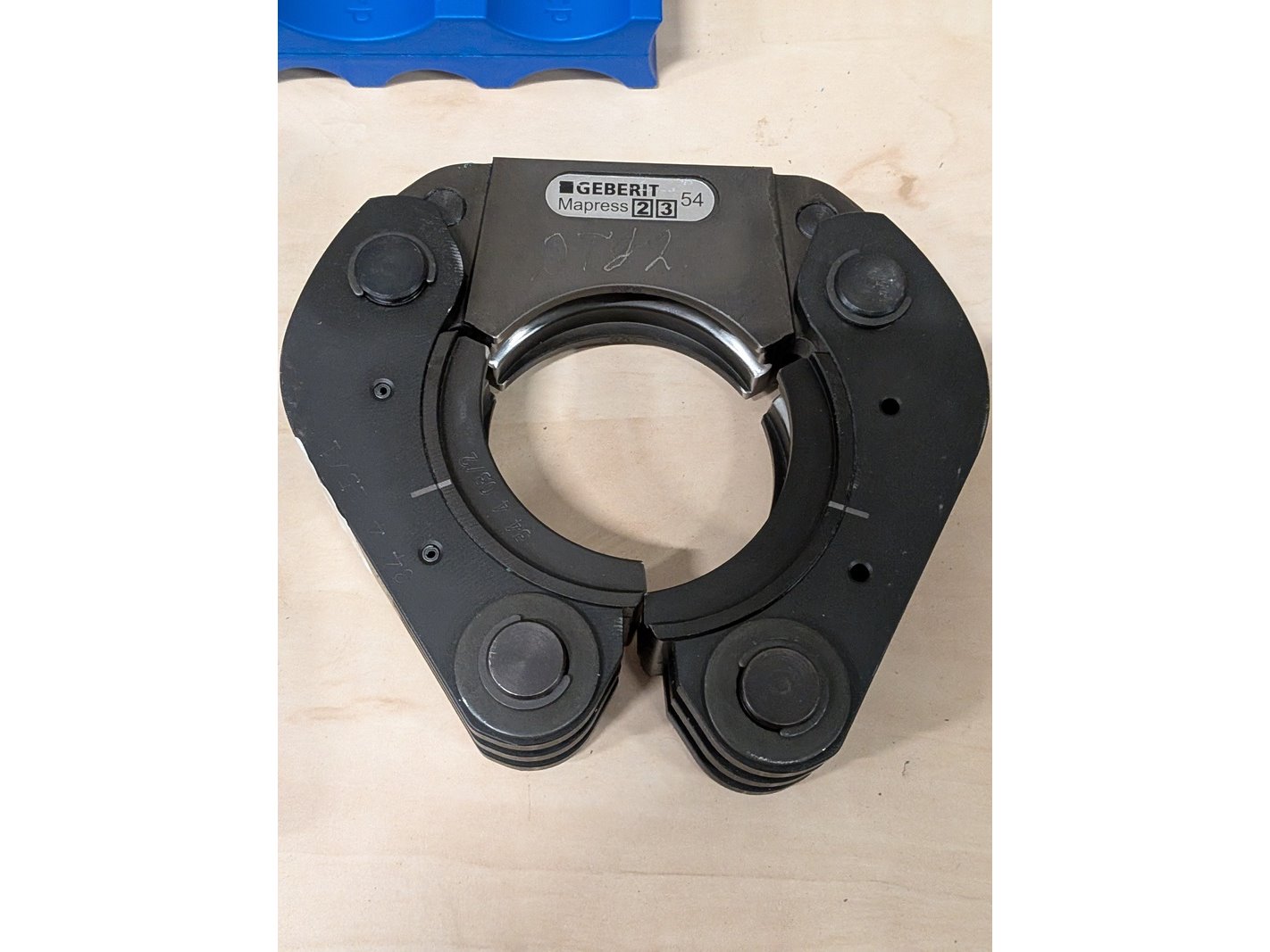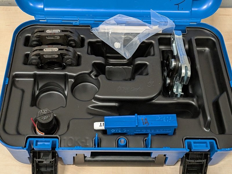 Merk: Geberit Product: Persbek set in koffer Specificaties: Bestaande uit 3x persbek: 42, 54, ZB 203A, met divers toebehoren in koffer