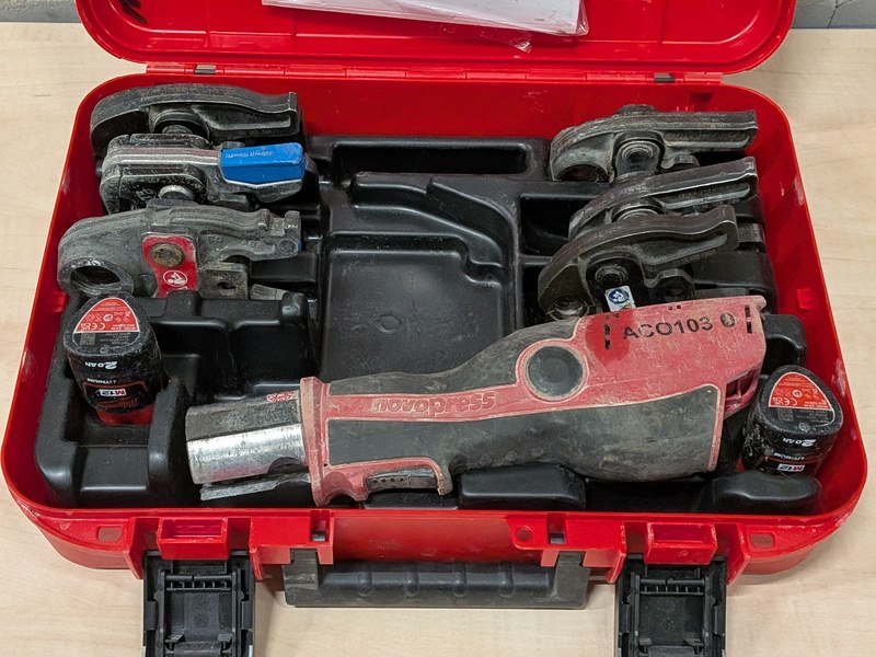 Merk: Novopress Product: Accu perstang BouwJaar: 2023 Specificaties: 2x accu 12V, 2.0Ah, lader, 6x persbek in koffer