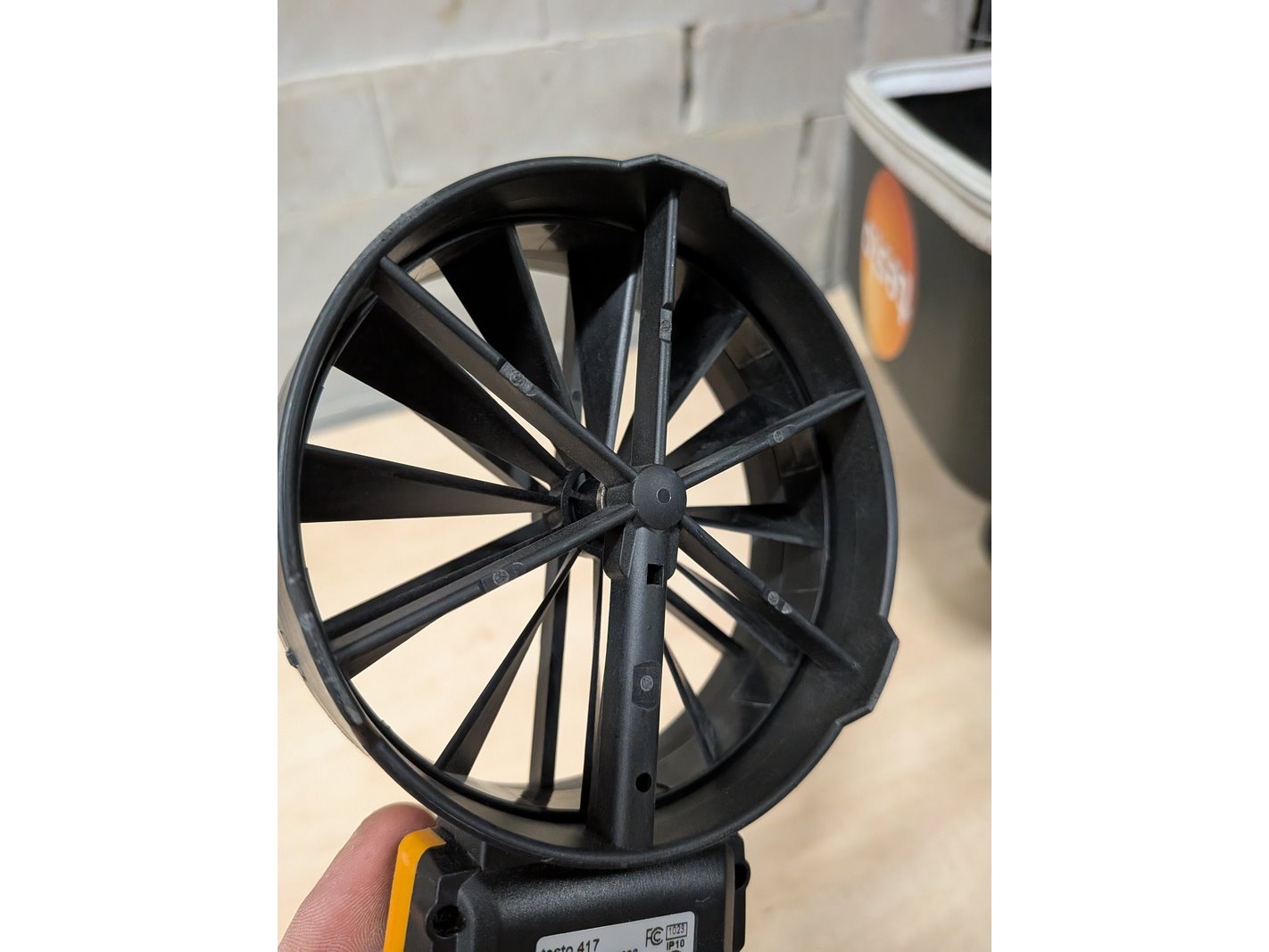 Merk: Testo Product: Vleugelrad-anemometer Specificaties: Werkt op 3x AA-batterijen Inclusief 2x trechter voor roosters en kleppen