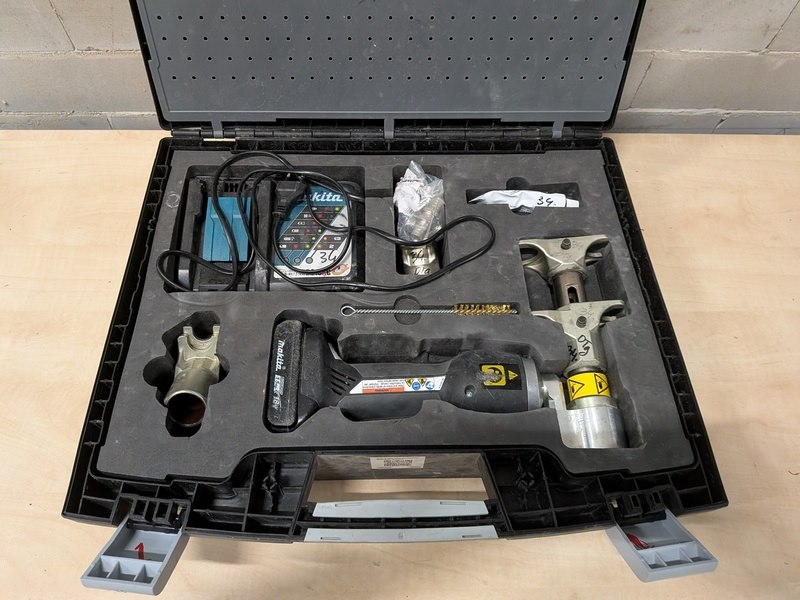 Merk: Rehau Product: Accu persmachine met accu persopwijkmachine Specificaties: Inclusief 1x accu Makita 18V 1.5Ah, Rehau opwijdtang In koffer met toebehoren Exclusief lader