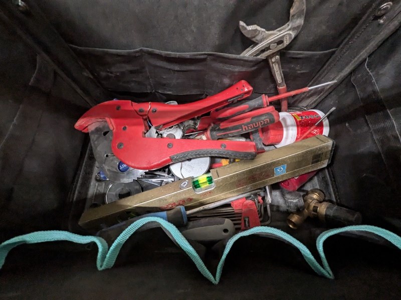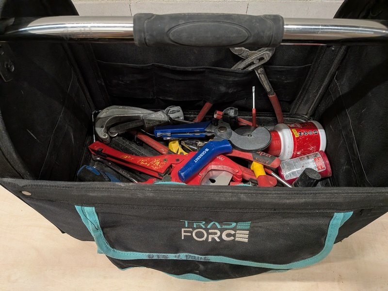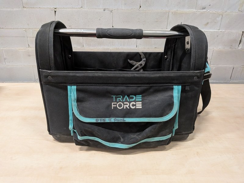 Merk: Trade Forge Product: Gereedschapstas Specificaties: Inhoud bestaande uit o.a.: waterpomptang, tang, schroevendraaier, buisschaar, waterpas, etc.