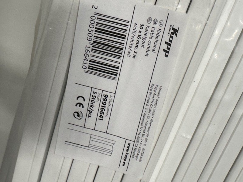 Merk: Kopp Product: Kabelgoot met deksel Afmeting: 30x15mm L200cm Specificaties: o.a. bochten, t-stukken, verlopen, moffen etc