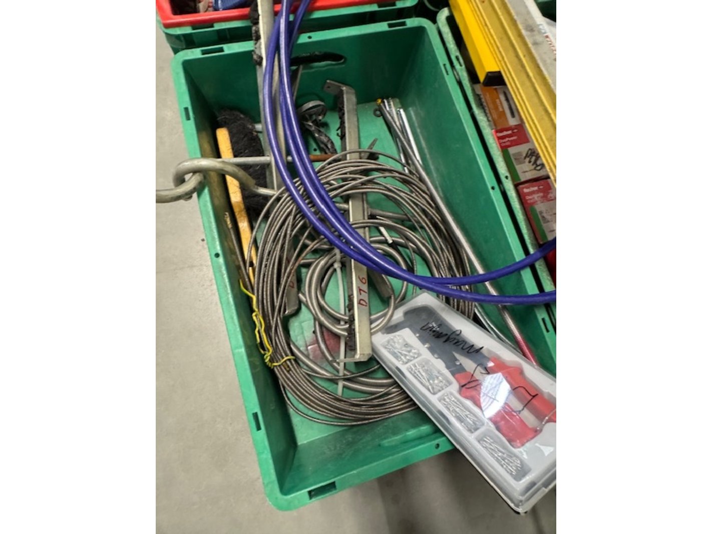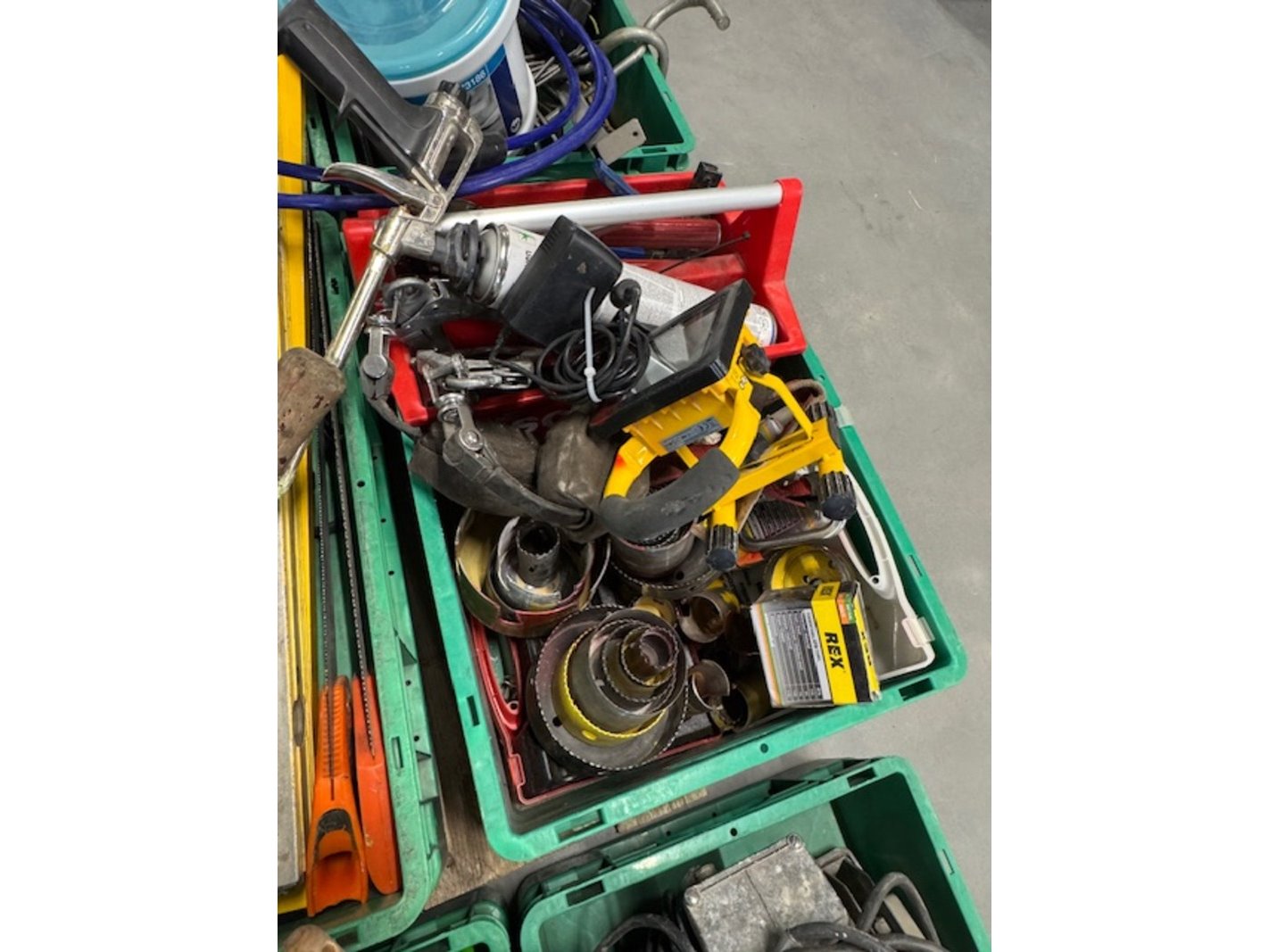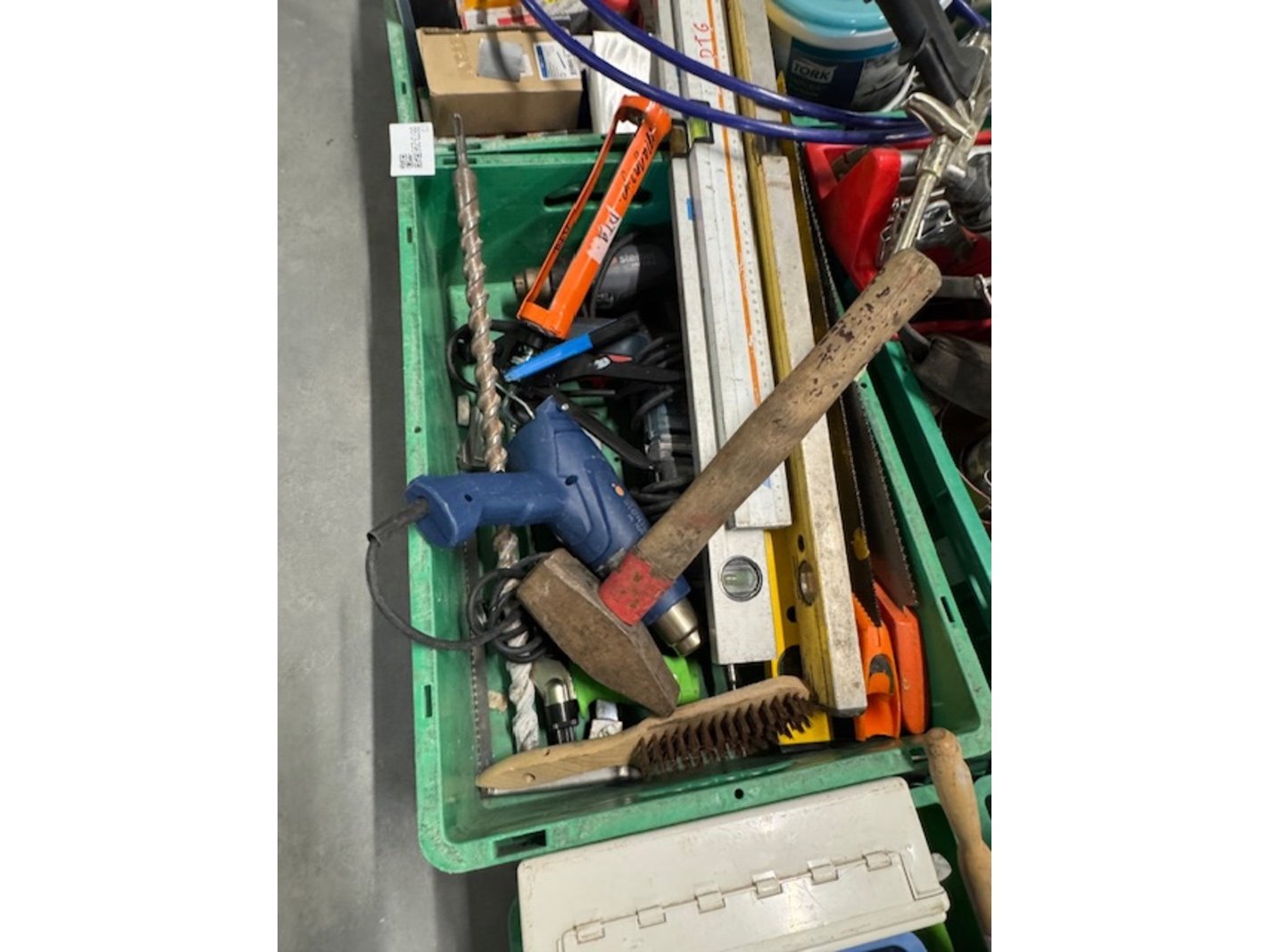 Product: Krat met gereedschap Specificaties: o.a.: bouwlampen, boren, schroevendraaiers, waterpassen, purspuiten, krat ijzerwaren, trekveren, trapje, 2x fohn, bosch boormachine, popnageltang, gatenboren etc