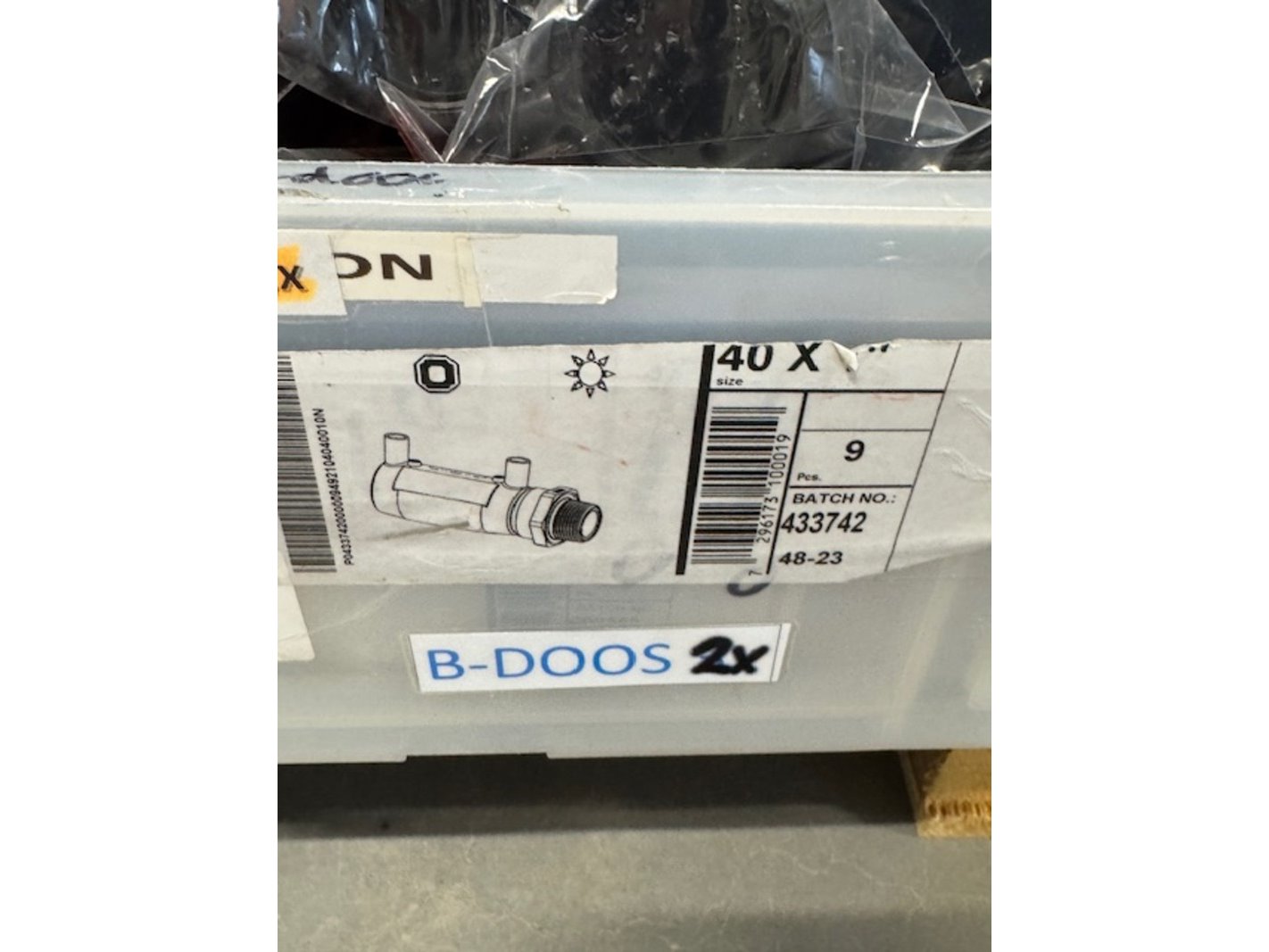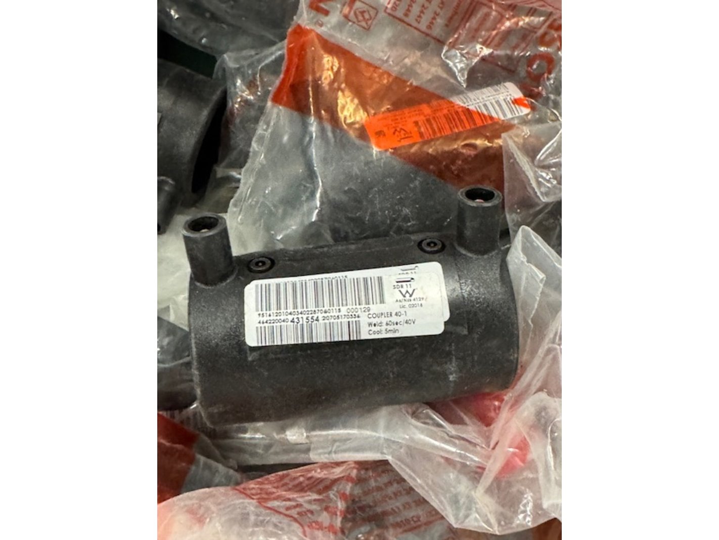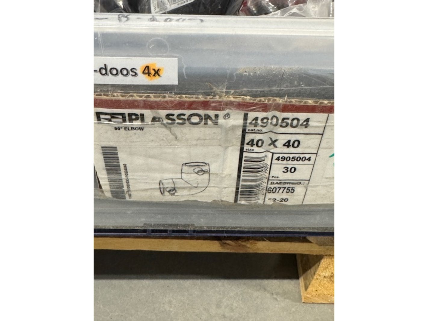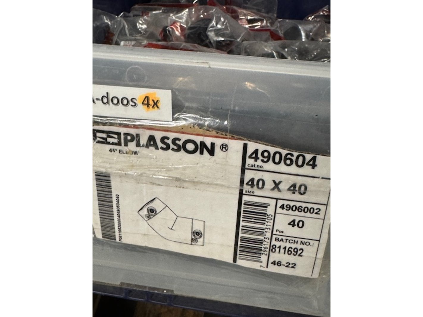 Merk: Plasson Product: Elektrolaskoppeling Specificaties: 2x coupler 40x1.1/4", 27x coupler 40-1, 17x 45 elbow 40, 6x elbow 90 40-1.1/4", 51x coupler 40x1", 30x 90 elbow 40, 41x coupler 40, 20x divers