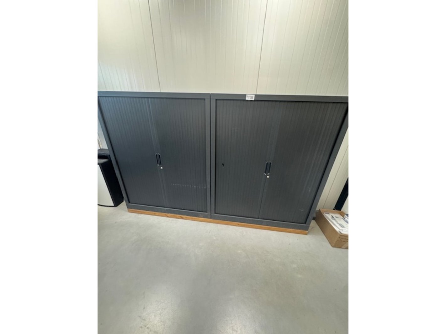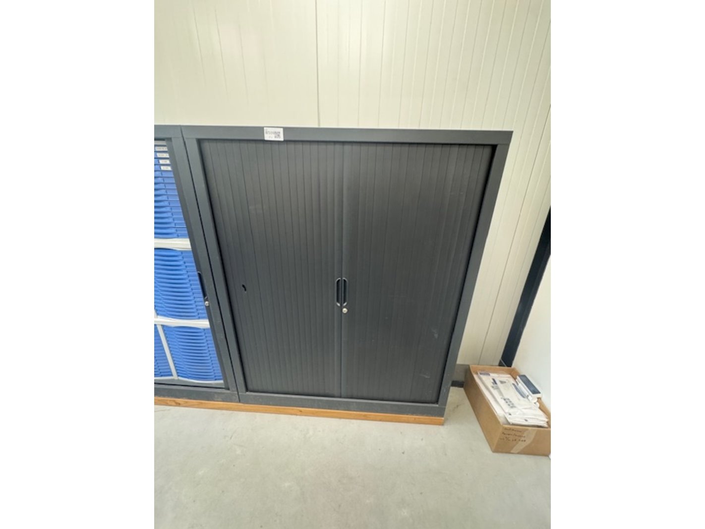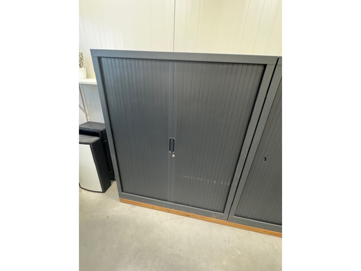 Product: Roldeurkast Kleur: antraciet Materiaal: metaal Afmeting: bxdxh ca. 120x 43x145cm Specificaties: Let op! Het afhalen van deze kavel is op afspraak.