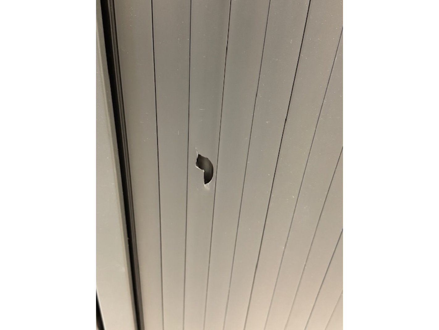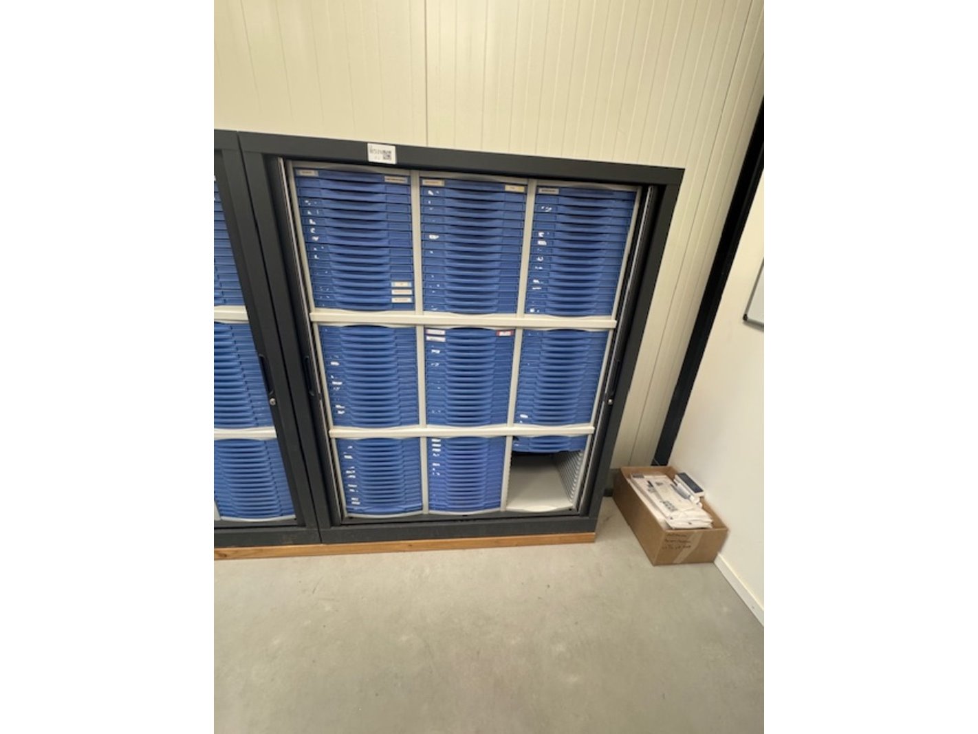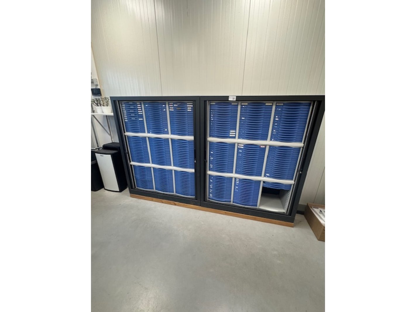 Product: Roldeurkast Kleur: antraciet Materiaal: metaal Afmeting: bxdxh ca. 120x 43x145cm Specificaties: Let op! Het afhalen van deze kavel is op afspraak.