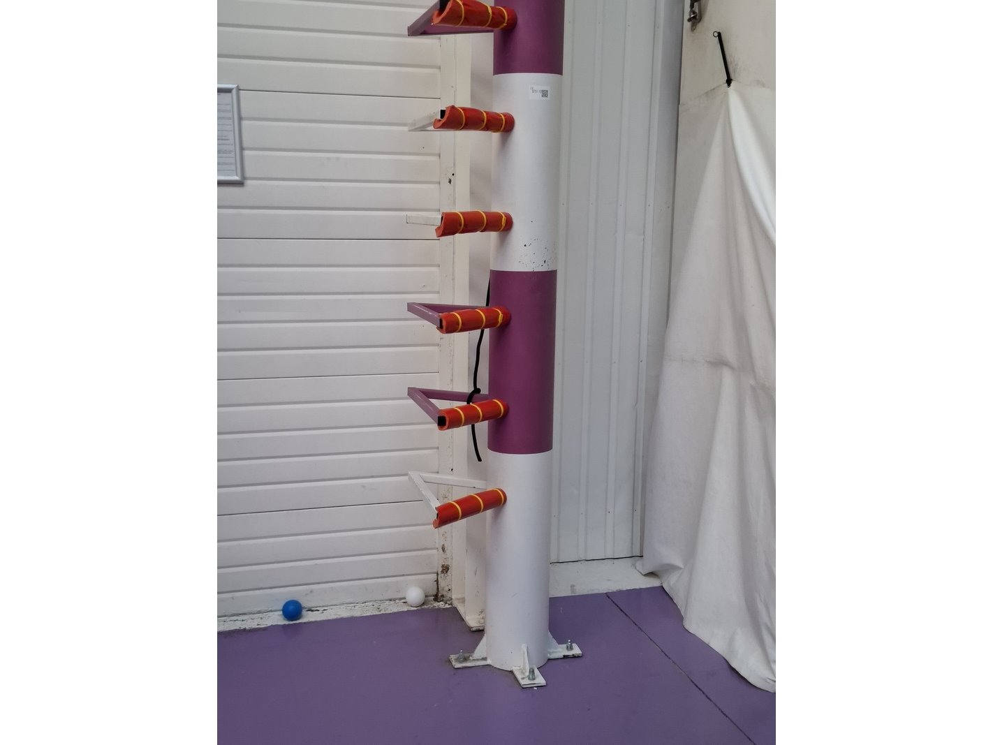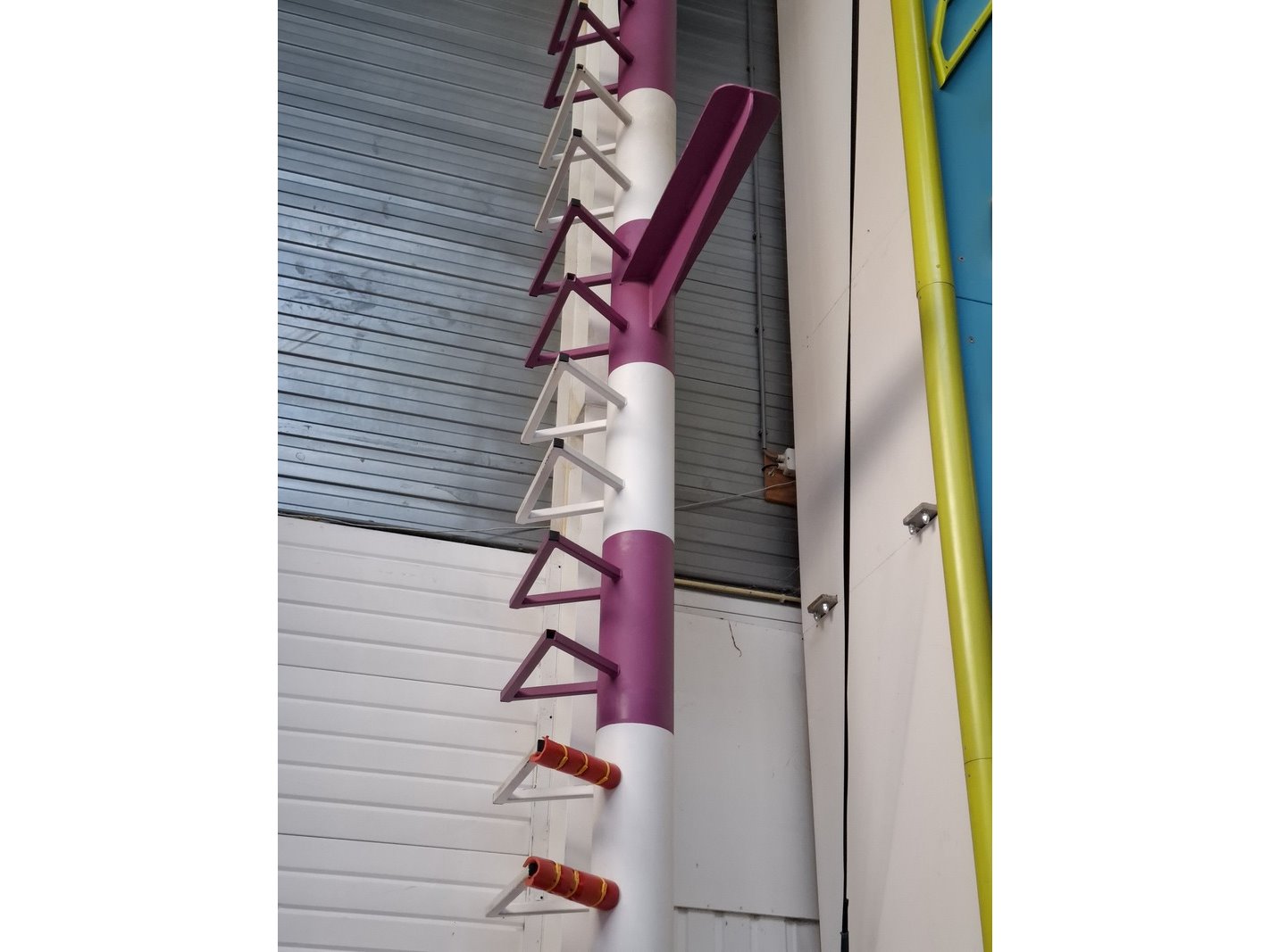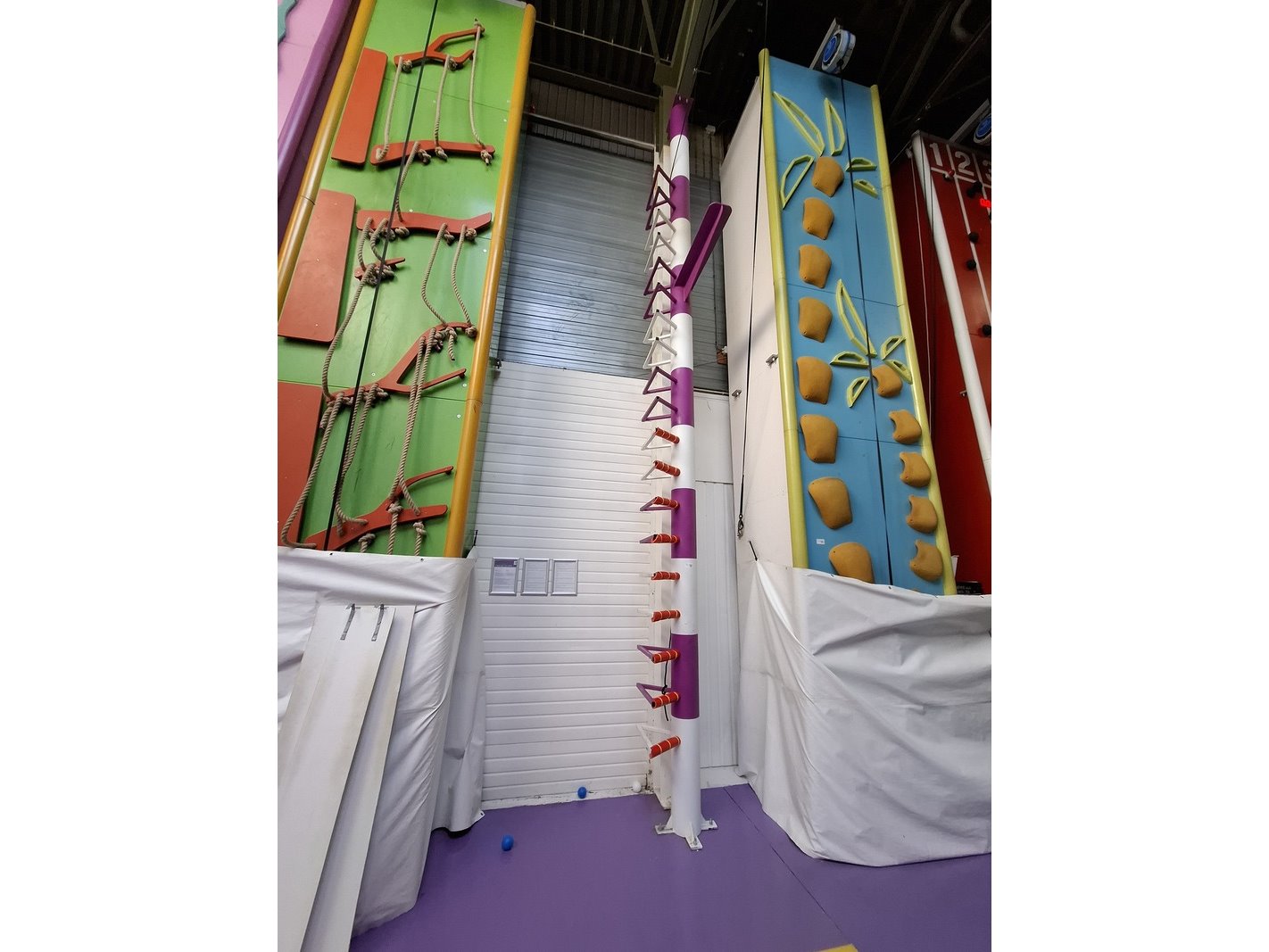 Merk: Banana Jump Product: Klimwand Afmeting: hoogte ca 750cm Specificaties: incl. Thru Blue systeem (valbeveiliging); metalen staander met tredes; banaan
