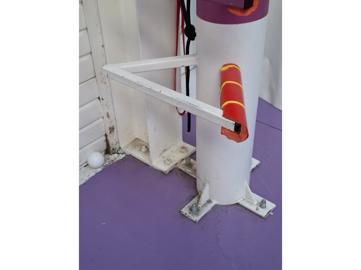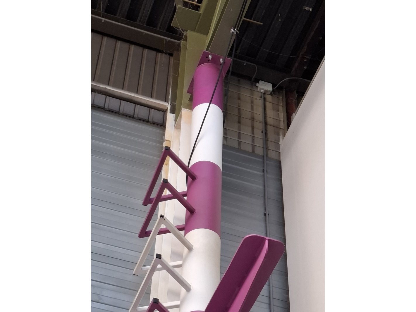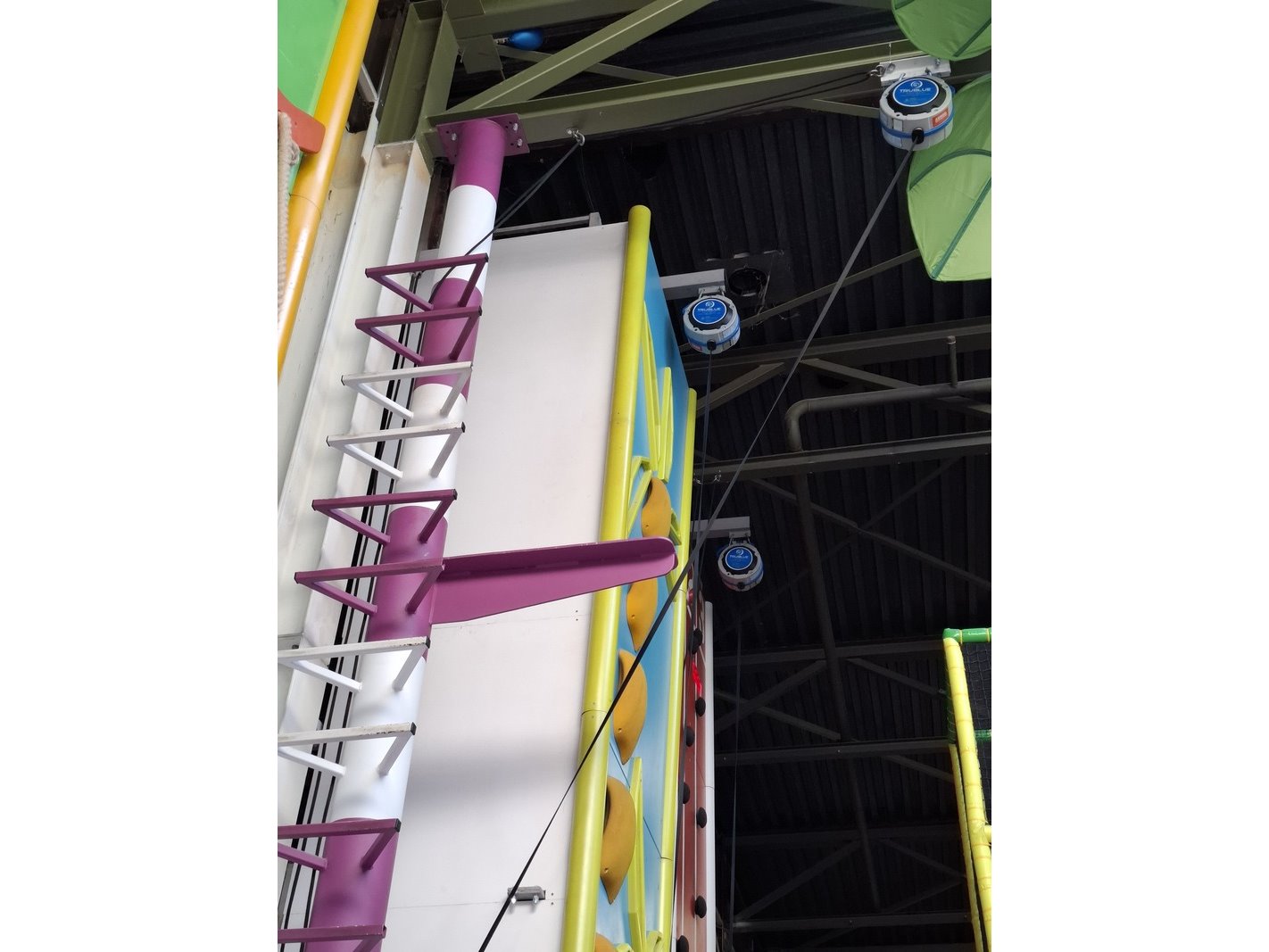 Merk: Banana Jump Product: Klimwand Afmeting: hoogte ca 750cm Specificaties: incl. Thru Blue systeem (valbeveiliging); metalen staander met tredes; banaan