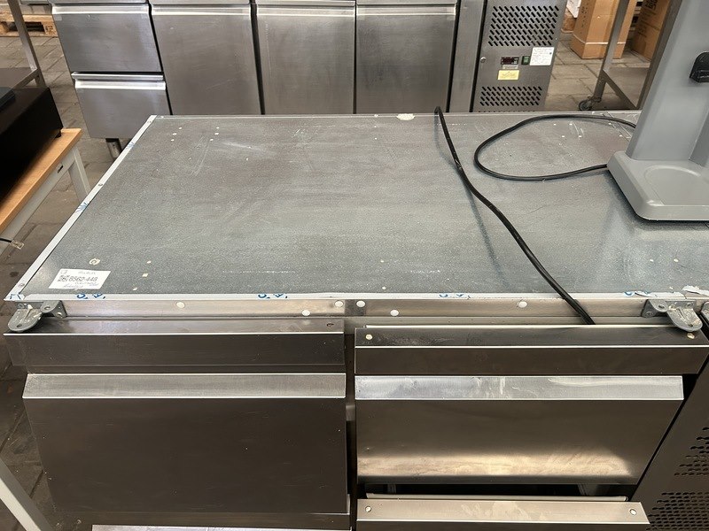 Merk: iL Product: Koelwerkbank met 4 lades 135x63x88 Conditie: gebruikt Specificaties: 2x rails treklade ontbreekt.