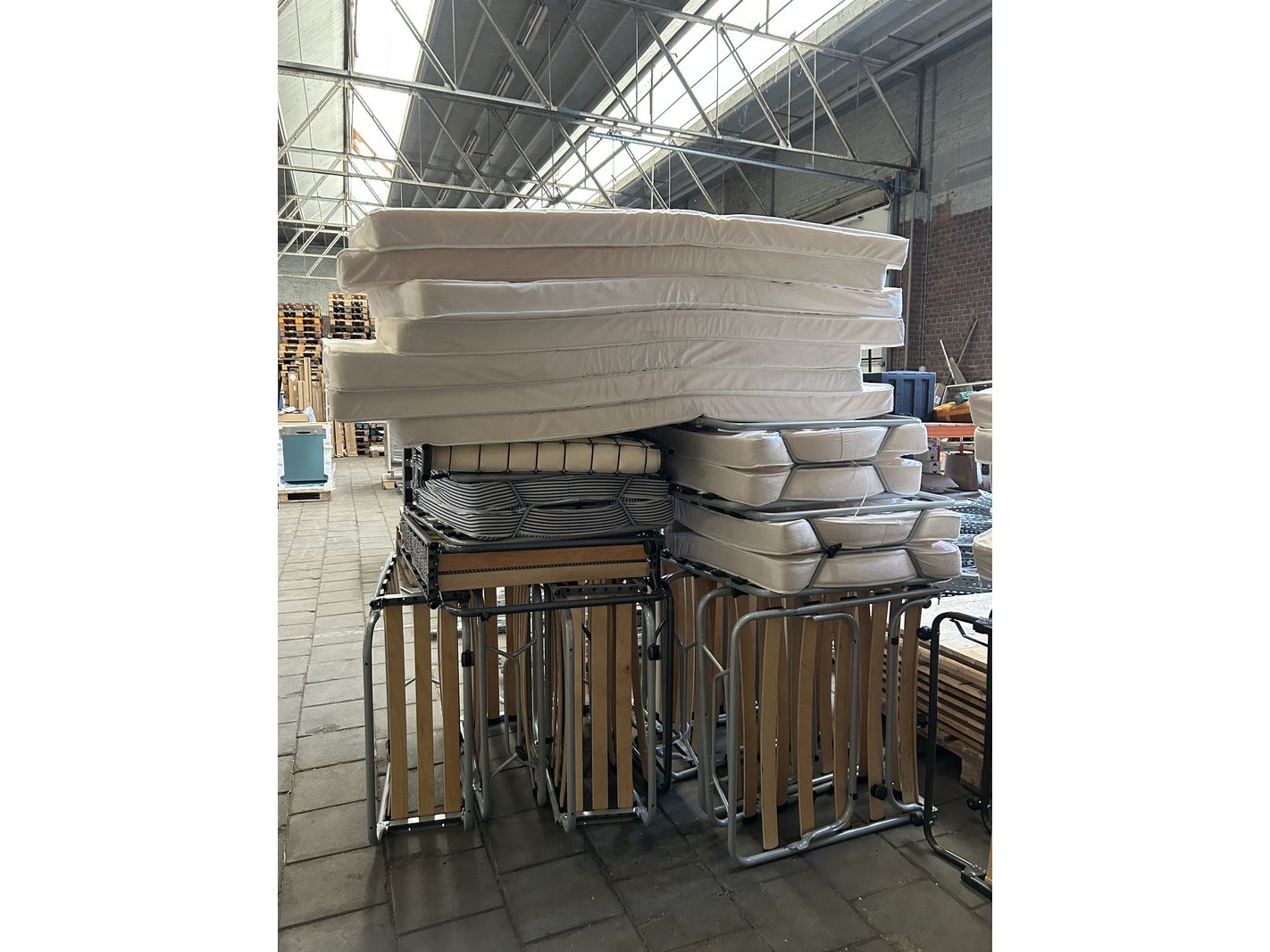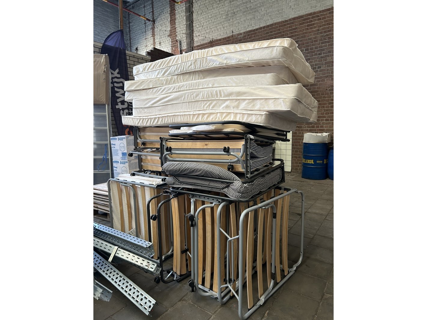 Product: Vouwbed Specificaties: Nieuw, showroom modellen en demo modellen. Een aantal bedden zonder wielen.