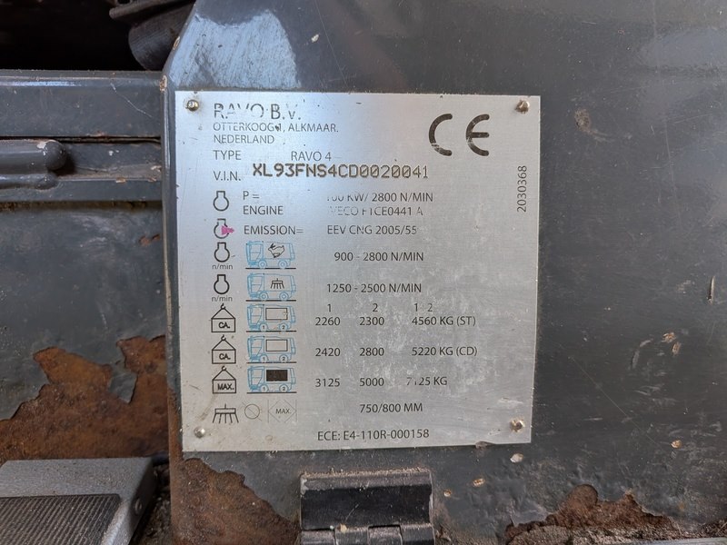 Merk: RAVO Product: Veegmachine BouwJaar: 2016 Specificaties: Basiskenmerken Kenteken: TPH-30-P Chassisnummer (VIN) : XL93FNS4CD0020041 Afgelezen tellerstand: 78.532 km Brandstof: cng Carrosserie: straatveger, straatreiniger Aantal zitplaatsen: 2 Registratie Datum eerste toelating: 30 juni 2016 Motor Type: IVECO F1CE0441 A Vermogen: 100 kW