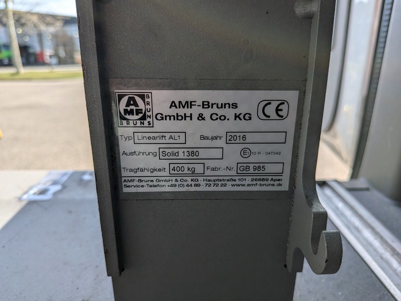 Merk: Mercedes-Benz Product: Personenauto BouwJaar: 2016 Specificaties: Basiskenmerken Kenteken: JN-315-X Chassisnummer (VIN) : ... Afgelezen tellerstand: 196.013 km Brandstof: diesel Carrosserie: 4-deurs, personenbus Aantal zitplaatsen: 7 Schakeling: 7 versnellingen, sequentiële automaat Registratie Datum eerste toelating: 18 mei 2016 APK vervaldatum: 18 mei 2026 Motor Motorcode: 651.955 Aantal cilinders: 4 Cilinderinhoud: 2.143 cm³ Max. vermogen: 95 kW / 129 pk Max. koppel: 305 Nm Milieu Brandstofverbruik gecombineerd (NEDC) : 7,1 l/100km Emissiecode: Euro 6 Specificaties (rolstoellift) Merk: AMF-Bruns Type: Linearlift AL1 Model: Solid 1380 Serienummer: GB 985 Bouwjaar: 2016 Hefvermogen: max. 400 kg Totale breedte: ca. 1.290 mm Platformbreedte: ca. 920 mm