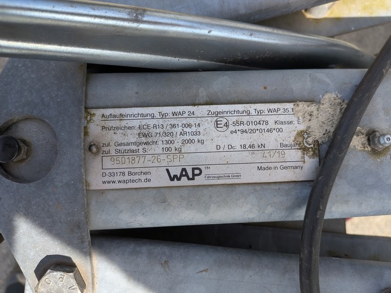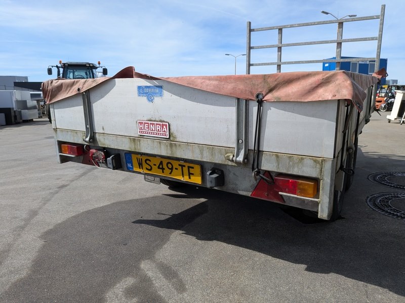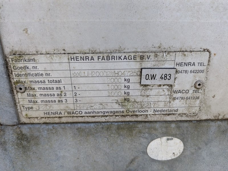 Merk: HENRA Product: Aanhangwagen BouwJaar: 1997 Specificaties: Basiskenmerken Kenteken: WS-49-TF Identificatienummer: XLUH20002VH047250 Registratie Datum eerste toelating: 4 november 1997 Maten & Gewichten Breedte: 1.780 mm Laadvloer (LxB) : ca. 3.000 x 1.700 mm Massa rijklaar: 530 kg Max. massa: 2.000 kg Laadvermogen: 1.470 kg