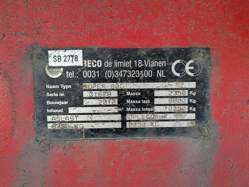 Merk: BECO Product: Landbouwkipwagen BouwJaar: 2012 Specificaties: Basiskenmerken Kenteken: LLP-43-Z Serienummer: 31678 Registratie Datum eerste toelating: 30 juni 2012 Gewichten & Belasting Eigen massa: 2.350 kg Nuttig laadvermogen: 8.000 kg Totaalgewicht: 10.350 kg Max. aslast: 8.750 kg Max. oplegdruk (op trekhaak) : 2.350 kg