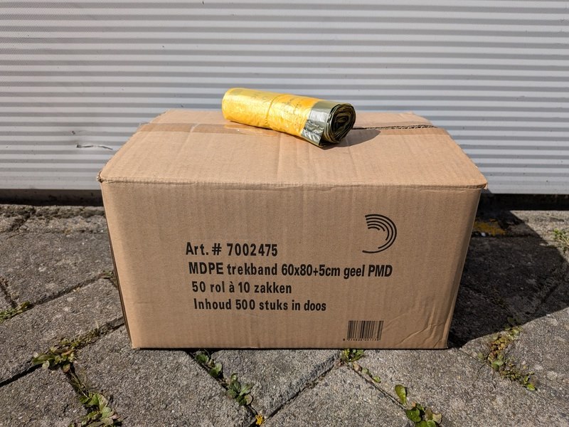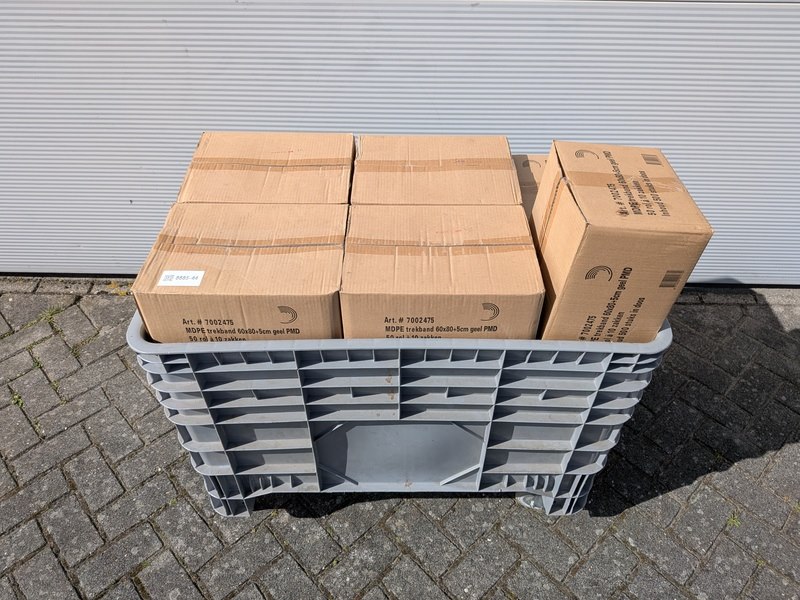 Product: doos MDPE-afvalzakken met trekband Conditie: Nieuw Specificaties: PMD-afvalzakken Formaat: 600 x 800 + 50 mm Aantal: 500 zakken per doos (totaal ca. 7.000 zakken) Beco Pets Poepzakjes Formaat: 225 x 330 mm (extra groot) Aantal: 300 zakjes per doos (totaal ca. 3.000 zakken) Inclusief verrijdbare kunststof palletbox