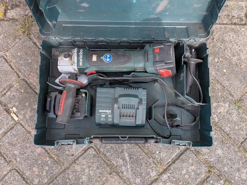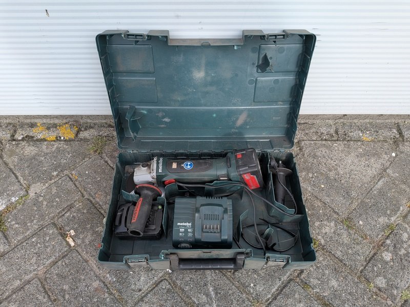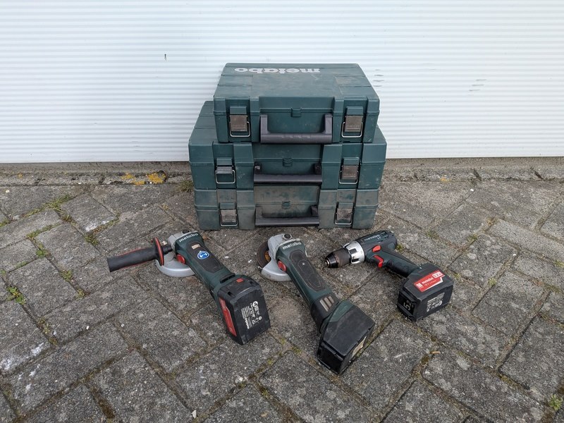 Merk: Metabo Product: Accu-schroefboormachine & 2x accu-haakse slijper Specificaties: Bestaande uit: • Accu-boorschroefmachine, Metabo BS 18 LT • Accu-haakse slijper, Metabo W 18 LTX 125 • Accu-haakse slijper, Metabo W 18 LTX 125 Quick • 6x 18V accu, Metabo • 3x Acculader, Metabo ASC 30-36V • 3x Opbergkoffer • Diverse accessoires