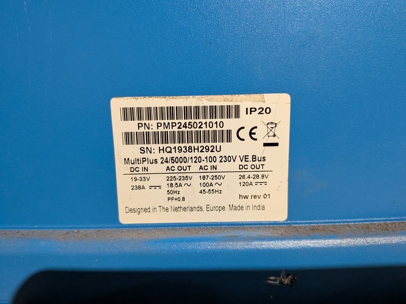 Merk: Victron energy Product: Omvormer/acculader Specificaties: Technische gegevens Ingangsspanning: 24 V Uitgangsspanning: 230 V Continu vermogen: 5.000 VA / 4.000 W Piekvermogen: 10.000 W Laadstroom: 120 A Doorschakelstroom: 100 A Afmeting (HxBxD) : 444 x 328 x 240 mm Gewicht: 30 kg