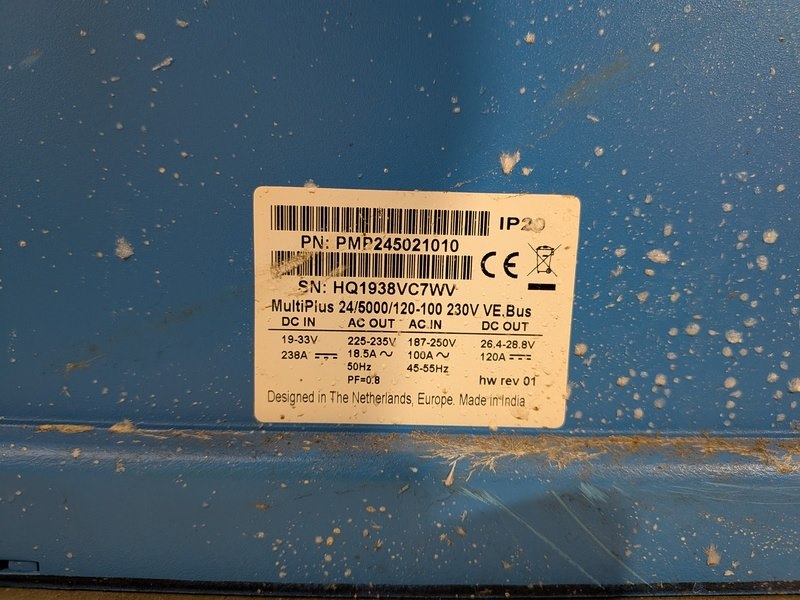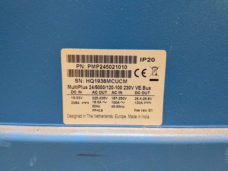 Merk: Victron energy Product: Omvormer/acculader Specificaties: Technische gegevens Ingangsspanning: 24 V Uitgangsspanning: 230 V Continu vermogen: 5.000 VA / 4.000 W Piekvermogen: 10.000 W Laadstroom: 120 A Doorschakelstroom: 100 A Afmeting (HxBxD) : 444 x 328 x 240 mm Gewicht: 30 kg