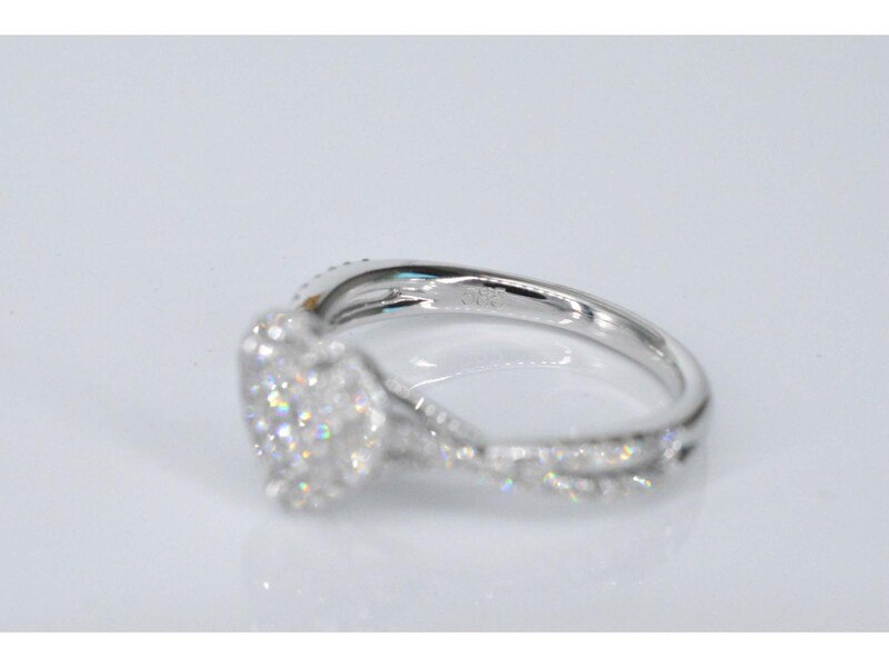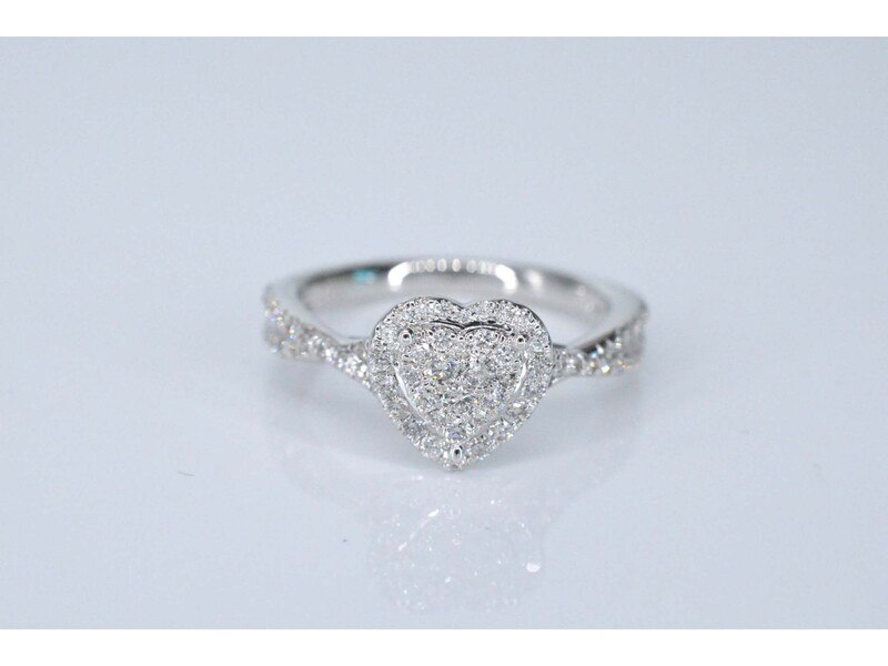 Product: Witgouden hartvormige entourage ring met diamanten Specificaties: Diamant: Natuurlijk Slijpvorm: Briljant geslepen Gewicht (carat): 0.60 carat Kleur: F-G Zuiverheid: SI-P Slijpkwaliteit: Zeer mooi Juweel: Ring Gewicht: 3.8 gram Ringmaat (op maat gemaakt*): 54 (17.25 mm) Materiaal: 14 karaat (585) Conditie: Nieuw Verpakking: Luxe sieradendoos Toelichting: De kwaliteit is overgenomen van het rapport behorend bij item. De waardebepaling is een beoordeling van een gecertificeerde diamantair, gebaseerd op consumentenprijzen. Consumentenprijs: € 3.938,- *Ringen kunnen als het mogelijk is op maat gemaakt worden.