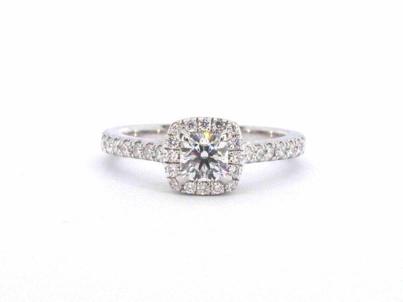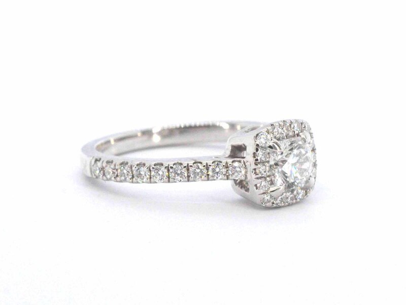 Product: Diamond Point - Witgouden hearts & arrows diamanten ring. Specificaties: Diamant: Natuurlijk Aantal: 1 stuk Slijpvorm: Cushion geslepen Gewicht (carat): 0.30 carat Kleur: F Zuiverheid: VS1 Diamant (secundair): Natuurlijk Aantal diamanten: 34 stuks Slijpvorm: Briljant geslepen Gewicht (carat): 0.25 Kleur: G Zuiverheid: VS Juweel: Ring Gewicht: 2.5 gram Ringmaat (op maat gemaakt*): 47 (15 mm) Materiaal: 18K goud (750) Conditie: Zo goed als nieuw Verpakking: Luxe sieradendoos Toelichting: De kwaliteit is overgenomen van het rapport behorend bij item. De waardebepaling is een beoordeling van een gecertificeerde diamantair, gebaseerd op consumentenprijzen. Consumentenprijs: € 7.700,- *Ringen kunnen als het mogelijk is op maat gemaakt worden.