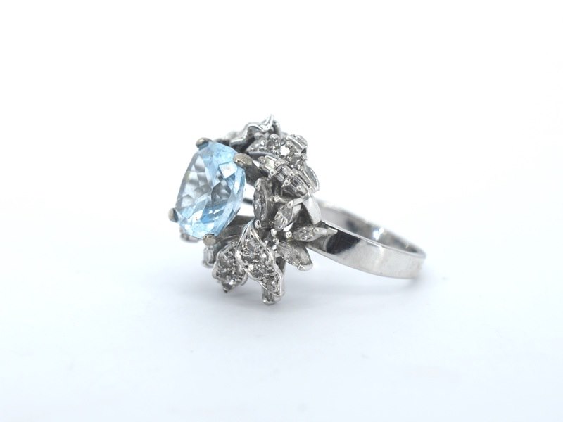 Product: Witgouden cocktail ring met een blauwe topaas Specificaties: Diamant: Natuurlijk Slijpvorm: marquise, baguette en swiss geslepen Gewicht (carat): 1.50 carat Kleur: F-G Zuiverheid: VS-SI Slijpkwaliteit: Zeer mooi Edelsteen: Natuurlijke topaas Aantal: 1 stuk Slijpvorm: Kussen geslepen Gewicht (carat): 4.00 carat Kleur: Licht blauw Zuiverheid: Hoge zuiverheidsgraad Slijpkwaliteit: zeer mooi Juweel: Ring Gewicht: 7 gram Ringmaat (op maat gemaakt*): 49.5 (15.75 mm) Materiaal: 9K goud (375) bwgg Conditie: Vintage Verpakking: Luxe sieradendoos Toelichting: De kwaliteit is overgenomen van het rapport behorend bij item. De waardebepaling is een beoordeling van een gecertificeerde diamantair, gebaseerd op consumentenprijzen. Consumentenprijs: € 9.600,- *Ringen kunnen als het mogelijk is op maat gemaakt worden.