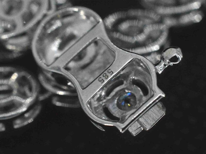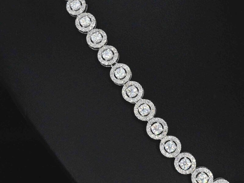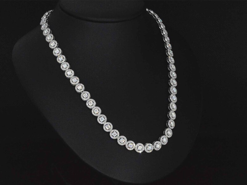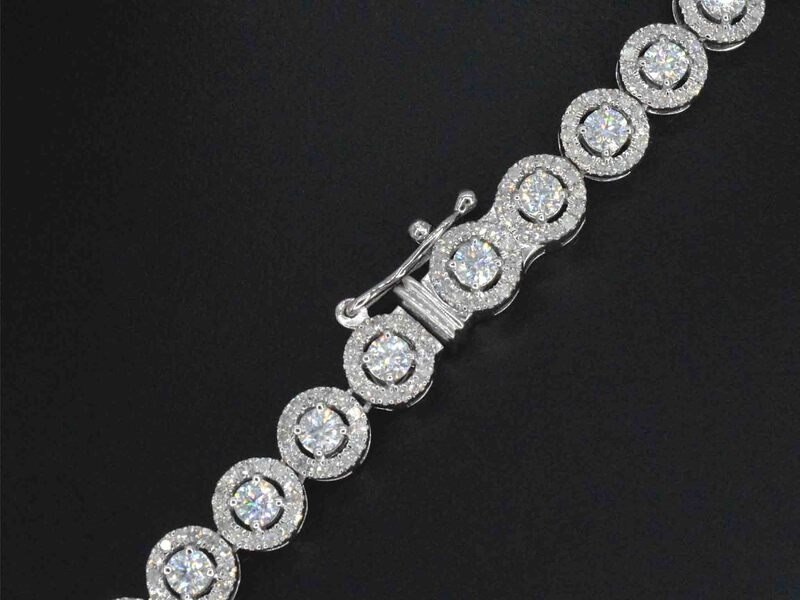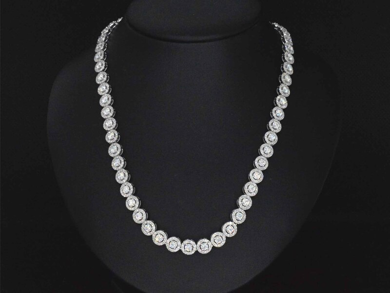 Product: Witgouden collier met diamanten en briljanten 12.50 carat Specificaties: Diamant: Natuurlijk Aantal: 994 stuks Slijpvorm: Rond geslepen Gewicht (carat): 4.50 carat Kleur: F-G Zuiverheid: VS-SI Slijpkwaliteit: mooi Edelsteen: Moissaniet Aantal: 71 stuks Slijpvorm: Briljant geslepen Gewicht (carat): 8.00 carat Kleur: D-E-F Zuiverheid: VS Slijpkwaliteit: Excellent Juweel: collier Gewicht: 38.6 gram Afmetingen/lengte: 46.5 cm Materiaal: 14 karaat (585) Conditie: Nieuw Verpakking: Luxe sieradendoos Toelichting: De kwaliteit is overgenomen van het rapport behorend bij item. De waardebepaling is een beoordeling van een gecertificeerde diamantair, gebaseerd op consumentenprijzen. Consumentenprijs: € 20.650,-