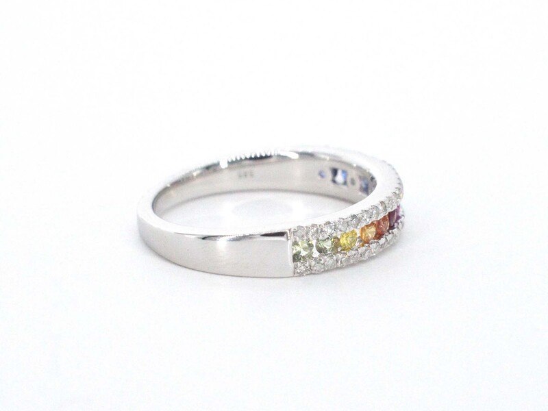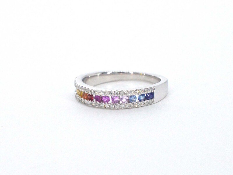 Product: Witgouden ring met diamanten en multicolor saffieren Specificaties: Diamant: Natuurlijk Slijpvorm: Briljant geslepen Gewicht (carat): 0.25 carat Kleur: H Zuiverheid: SI Slijpkwaliteit: Zeer mooi Edelsteen: Saffier Slijpvorm: Rond geslepen Gewicht (carat): 0.35 carat Kleur: Blauw, rood, roze, oranje, geel, groen Juweel: Ring Gewicht: 3.6 gram Ringmaat (op maat gemaakt*): 54 (17.25 mm) Materiaal: 14 karaat (585) Conditie: Nieuw Verpakking: Luxe sieradendoos Toelichting: De kwaliteit is overgenomen van het rapport behorend bij item. De waardebepaling is een beoordeling van een gecertificeerde diamantair, gebaseerd op consumentenprijzen. Consumentenprijs: € 3.273,- *Ringen kunnen als het mogelijk is op maat gemaakt worden