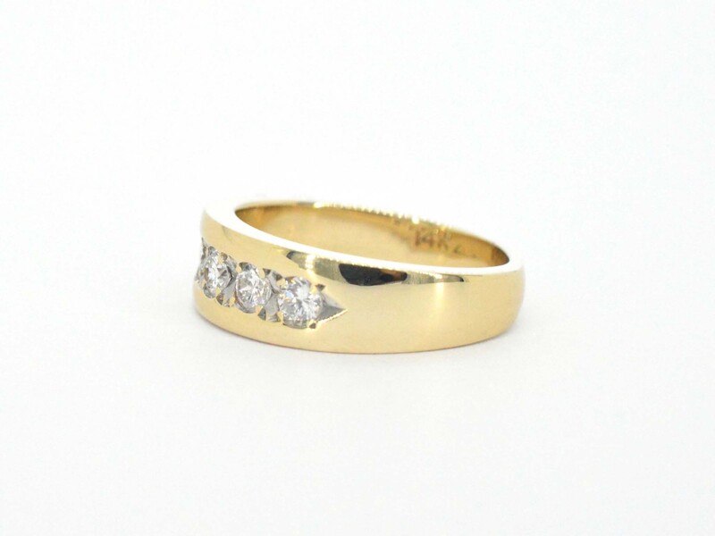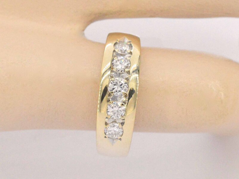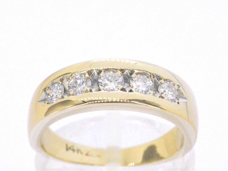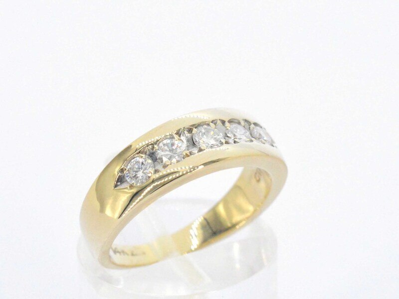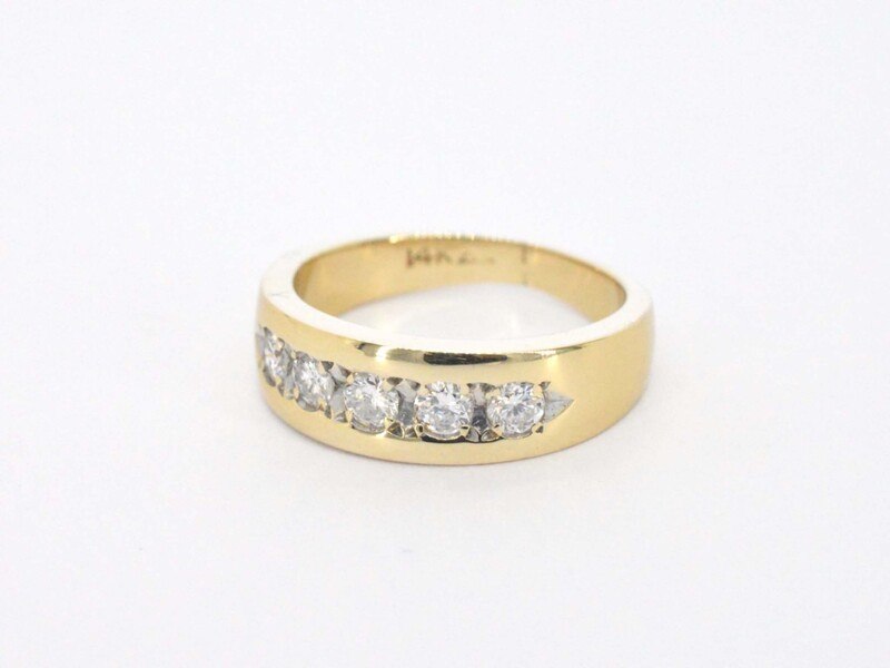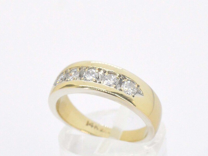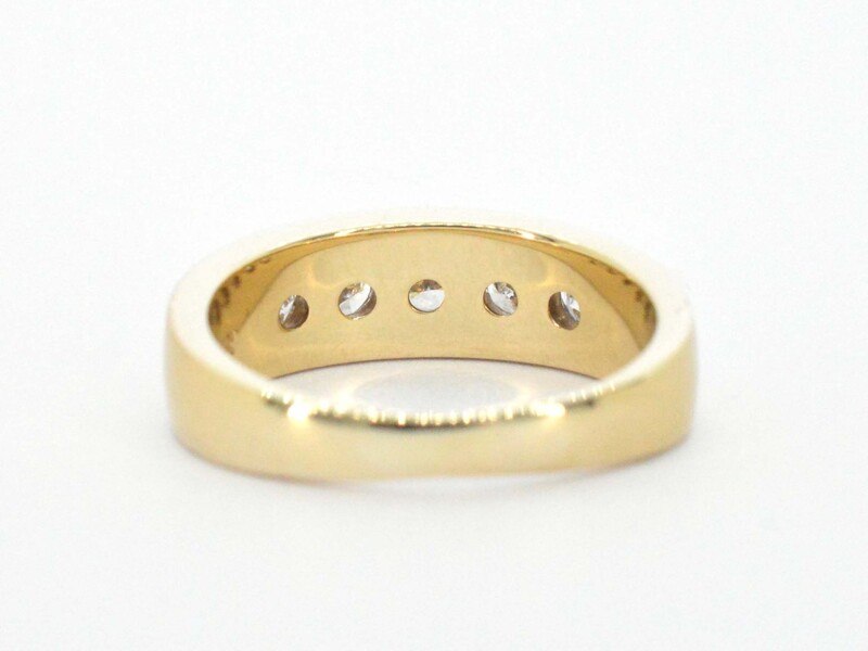 Product: Gouden rijring met diamanten Specificaties: Diamant: Natuurlijk Aantal: 5 stuks Slijpvorm: Briljant geslepen Gewicht (carat): 0.50 carat Kleur: F Zuiverheid: VS Slijpkwaliteit: Zeer mooi Juweel: Ring Gewicht: 4.4 gram Ringmaat (op maat gemaakt*): 49.5 (15.75 mm) Materiaal: 14K goud (585) Conditie: Zo goed als nieuw Verpakking: Luxe sieradendoos Toelichting: De kwaliteit is overgenomen van het rapport behorend bij item. De waardebepaling is een beoordeling van een gecertificeerde diamantair, gebaseerd op consumentenprijzen. Consumentenprijs: € 5.390,- *Ringen kunnen als het mogelijk is op maat gemaakt worden
