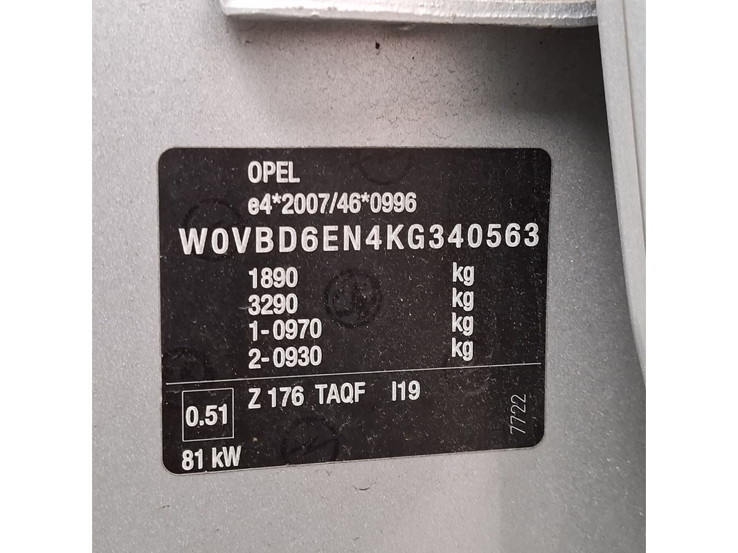 Merk: Opel Product: Personenauto Conditie: gebruikt Specificaties: Kenteken: Niet geregistreerd Eerste toelating nationaal: Niet geregistreerd APK vervaldatum: Niet van toepassing Brandstof: Diesel Transmissie: Handgeschakeld, 6 versnellingen Afgelezen tellerstand: 218.458 Aantal sleutels: 2 VIN nummer: W0VBD6EN4KG340563 Start: ja Opties e.d. Elektrische ramen en spiegels Airconditioning Cruisecontrol Navigatie Radio met display Parkeersensoren Waargenomen gebreken Gebruikssporen rondom Het Certificaat van Overeenstemming (CVO) is aanwezig bij het voertuig.