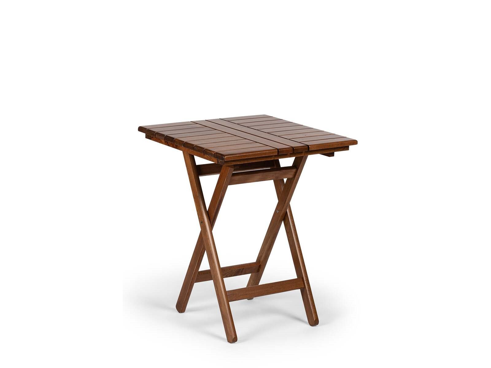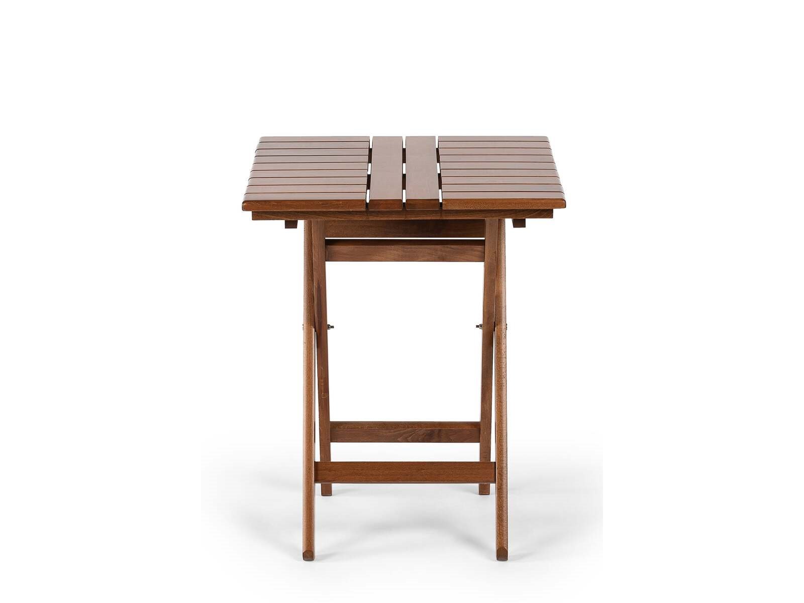 Product: Tafel Kleur: walnoot Materiaal: haagbeukhout Afmeting: 70x70x74 Conditie: nieuw Specificaties: opvouwbare tafel