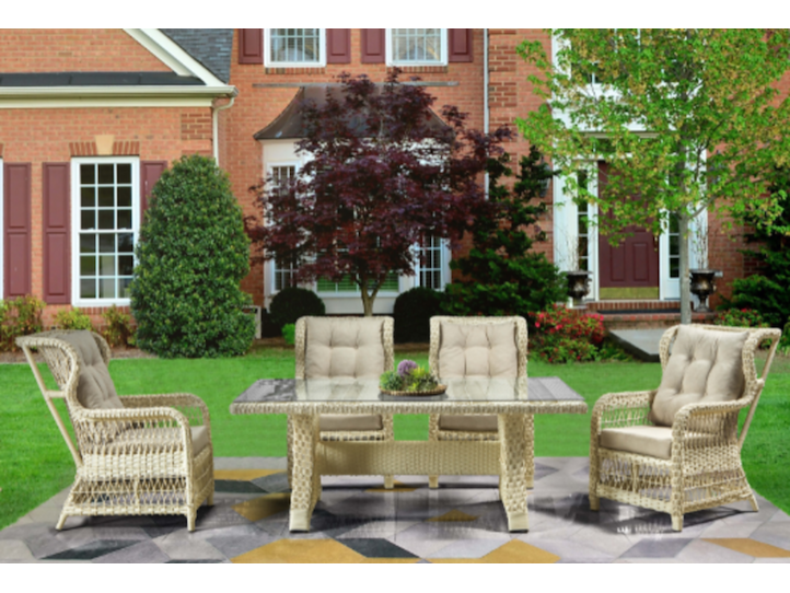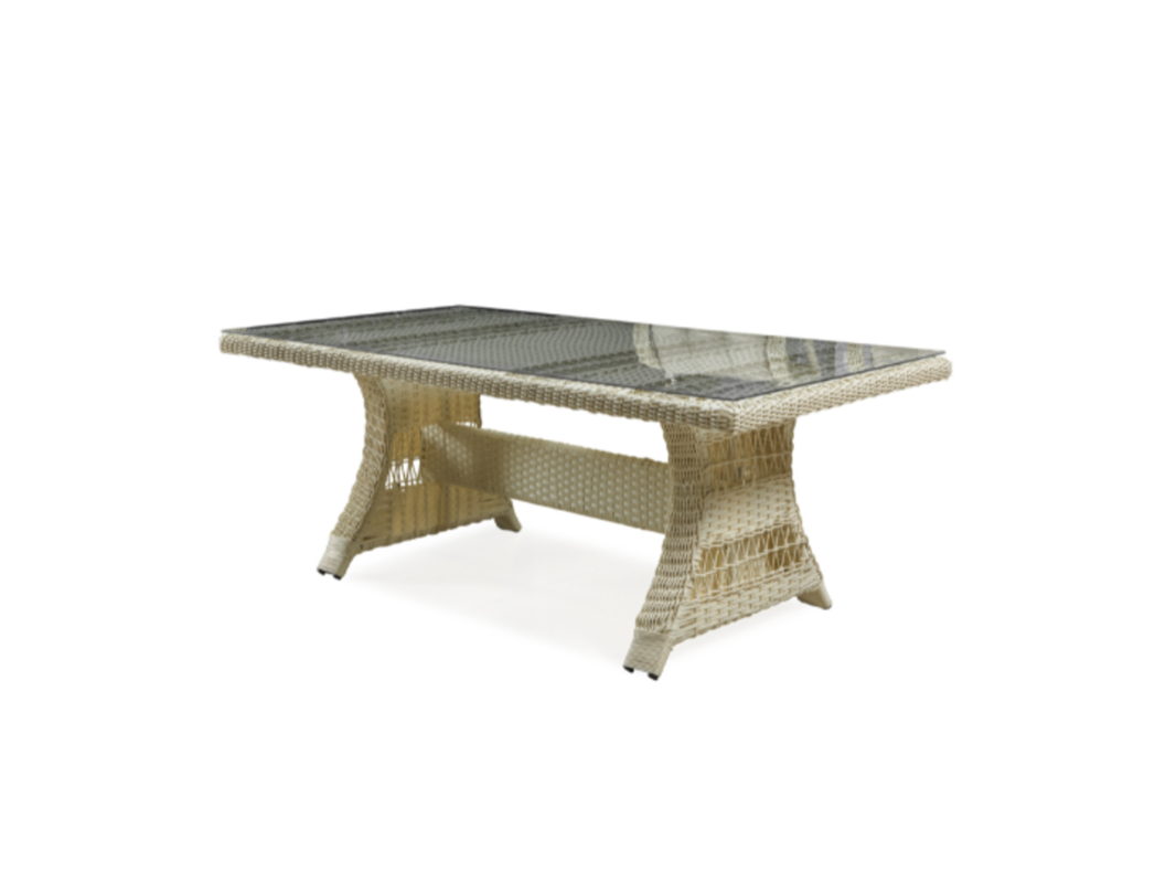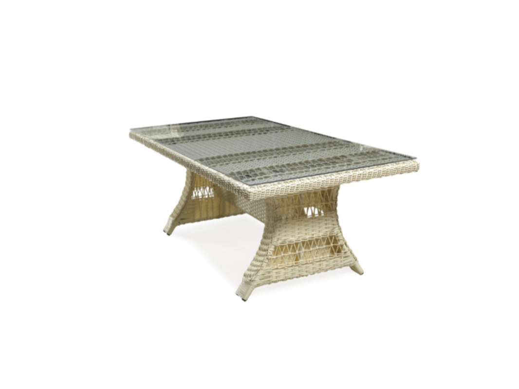 Product: Tuinset Kleur: creme Materiaal: aluminium frame, polyrotan, stof Afmeting: stoel: 85x55x40 tafel: 180x90x77 Conditie: nieuw Specificaties: waterbestendig incl. glasplaat 4 pers.