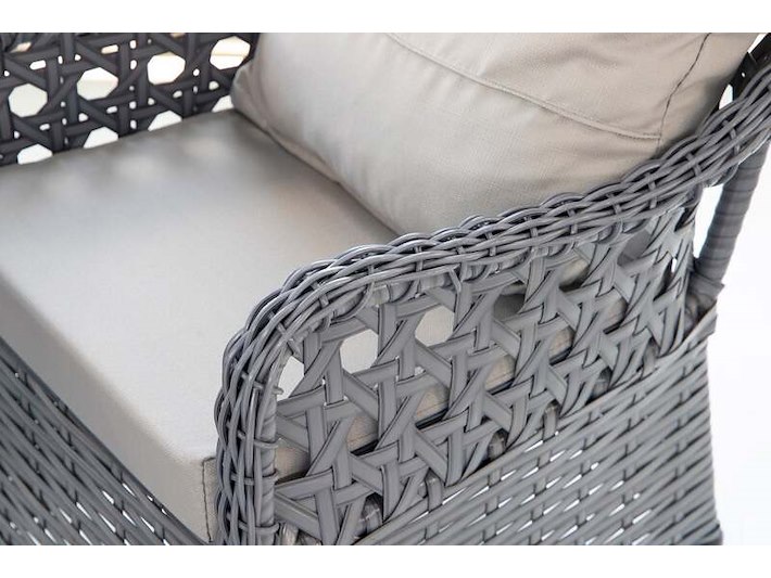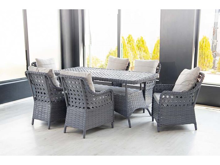 Product: Tuinset Kleur: antraciet Materiaal: aluminium frame, polyrotan, stof Afmeting: stoel: 85x55x40 tafel: 180x90x77 Conditie: nieuw Specificaties: waterbestendig incl. glasplaat 6 pers.