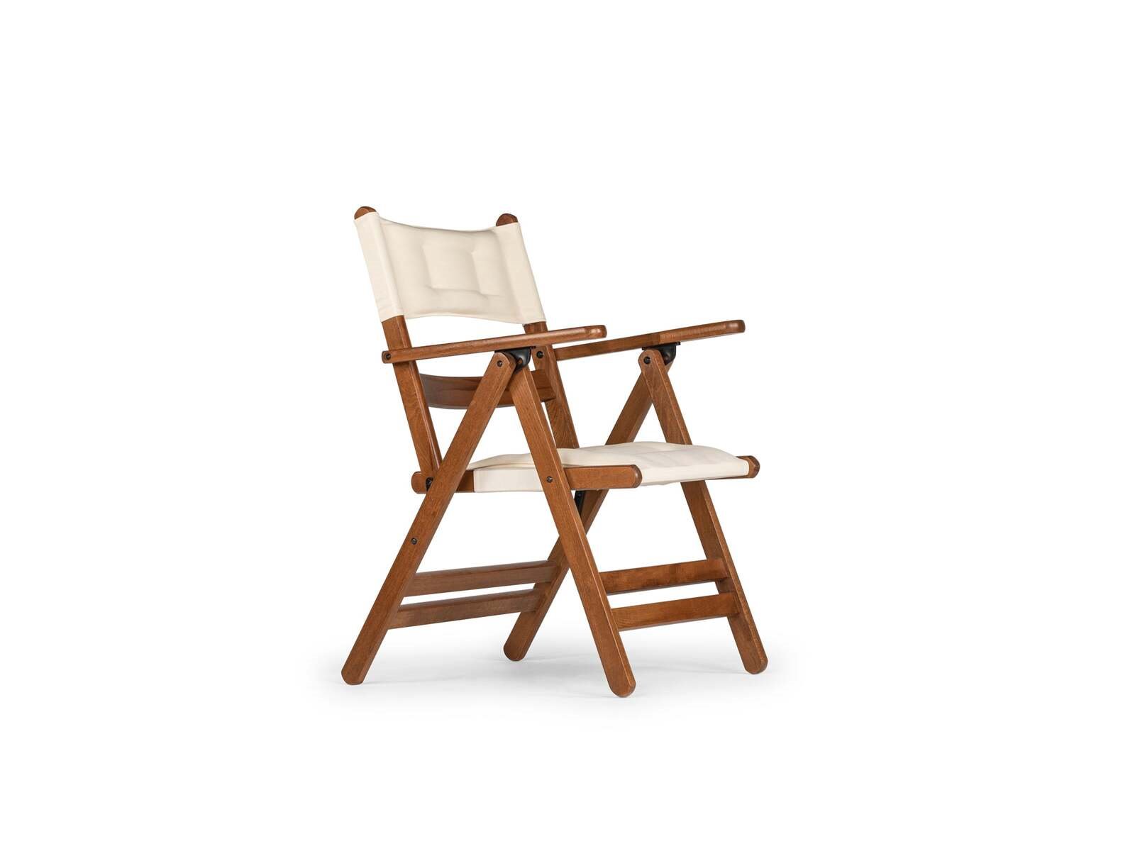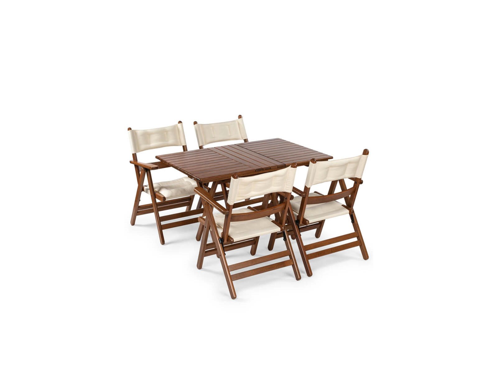 Product: Tuinset Kleur: walnoot, creme Materiaal: haagbeukhout, stof Afmeting: stoel: 64x56x85 tafel: 120x80x74 Conditie: nieuw Specificaties: tafel en stoelen opvouwbaar waterbestendig 4pers