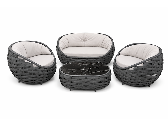 Product: Loungeset Kleur: antraciet Materiaal: aluminium frame, stof Afmeting: tafel: diameter 85x40 Conditie: nieuw Specificaties: bank 2 stoelen tafel met glasplaat (keuze doorzichtig/getint glas)
