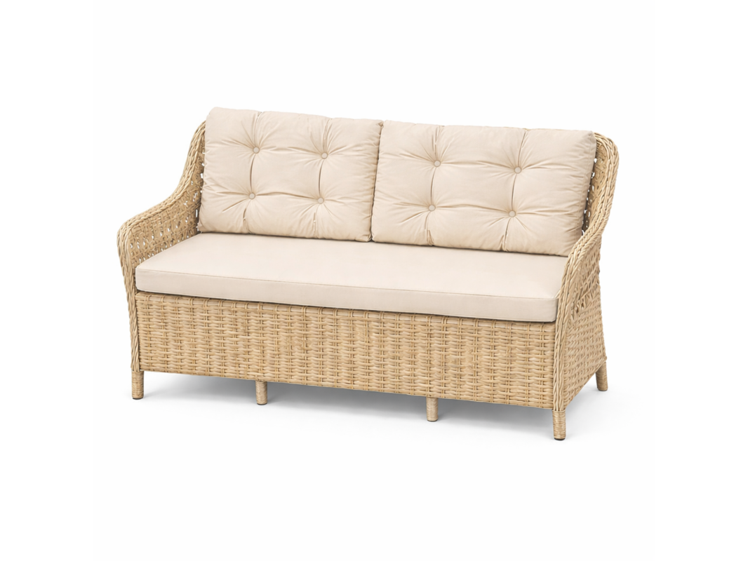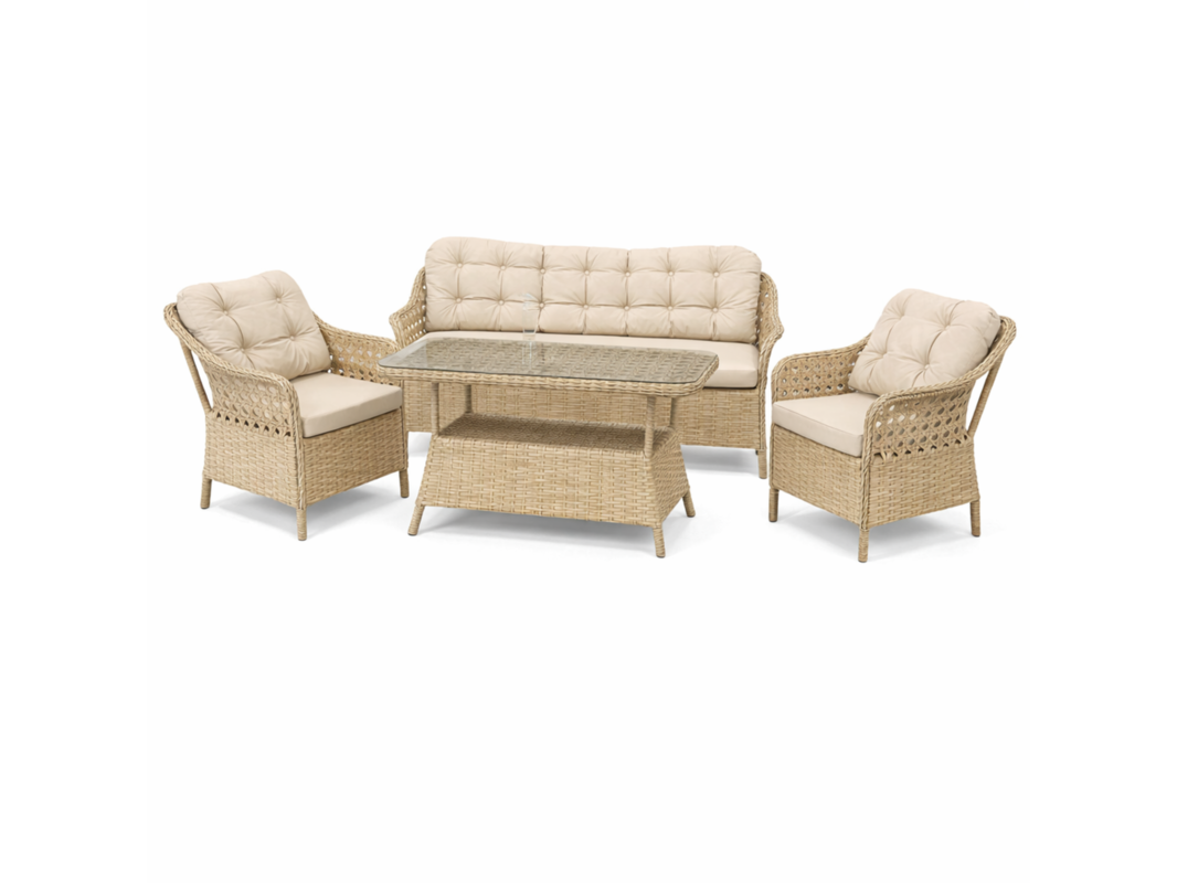 Product: Tuinset Kleur: creme Materiaal: aluminium frame, polyrotan, stof Afmeting: tafel: 122x70x72 bank: 140x70x90, stoel: 63x70x90 Conditie: nieuw Specificaties: bank 2 stoelen tafel met glasplaat